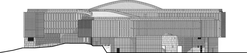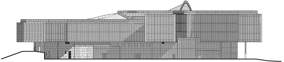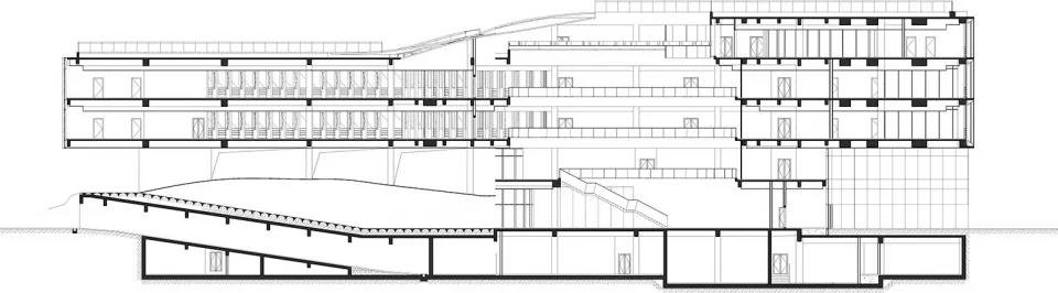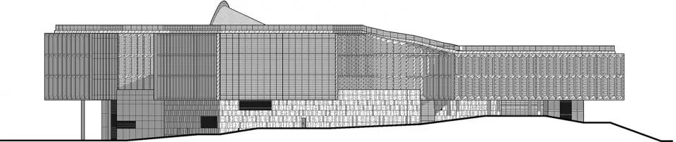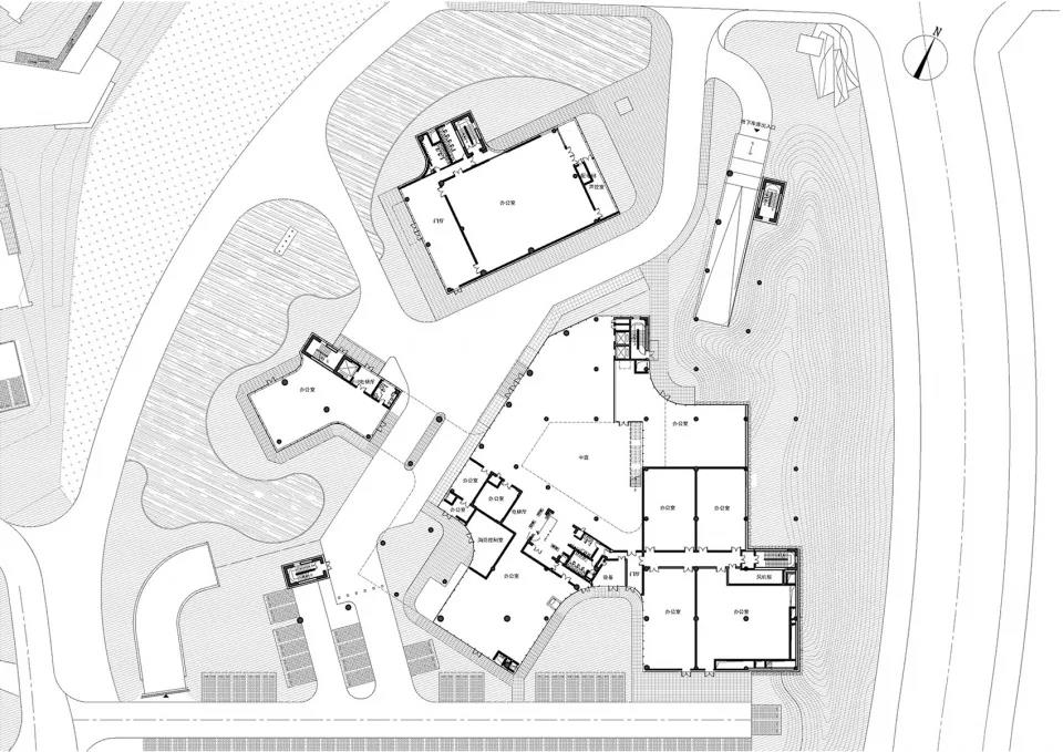 東南側建筑體量集中,嵌入高差地形,縫合場地高差;北側量體完全架空,使得延綿起伏的地面景觀延伸進架空區域,與東南側首層建筑量體融為一體;西側場地放置大小不一,高低錯落的“建筑物體”,既是結構的支撐,有效區分場地空間領域,同時為區域人員提供了有頂遮陽、開放的南方公共空間。