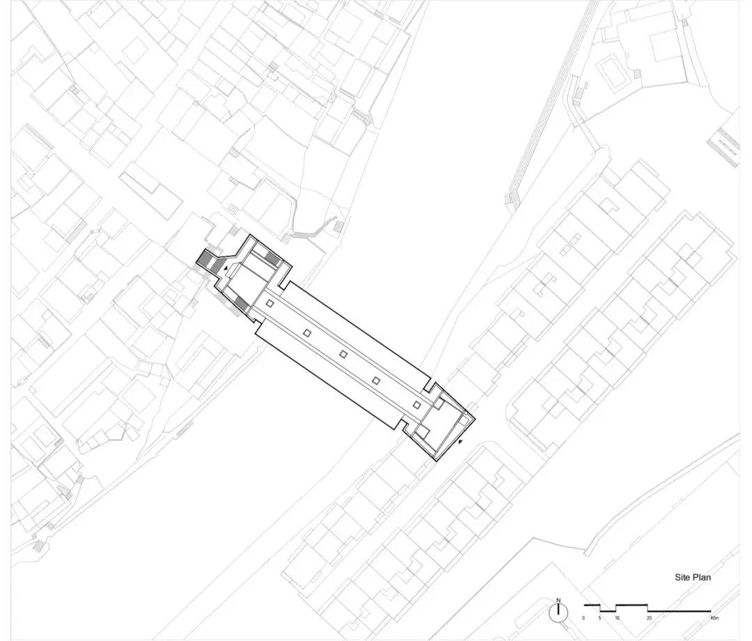 如今,許多諸如博物館和劇院的當(dāng)代文化設(shè)施都被當(dāng)作獨立的紀(jì)念物而遠(yuǎn)離社區(qū)。我們認(rèn)為美術(shù)館不應(yīng)該從區(qū)位上脫離受眾,因此將其嵌入到現(xiàn)有的城市肌理中,兩岸的橋頭部分與萬溶江畔的排屋緊密相連在一起。這些排屋包含了店鋪、餐館、小旅館,樓上通常便是屋主的居所。因此,吉首美術(shù)館位于河兩岸的入口都可以被視作混合功能街道界面的一部分,從而融入當(dāng)?shù)厝说娜粘I睢?/span>