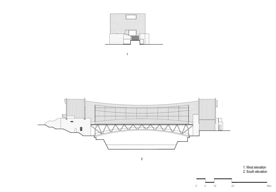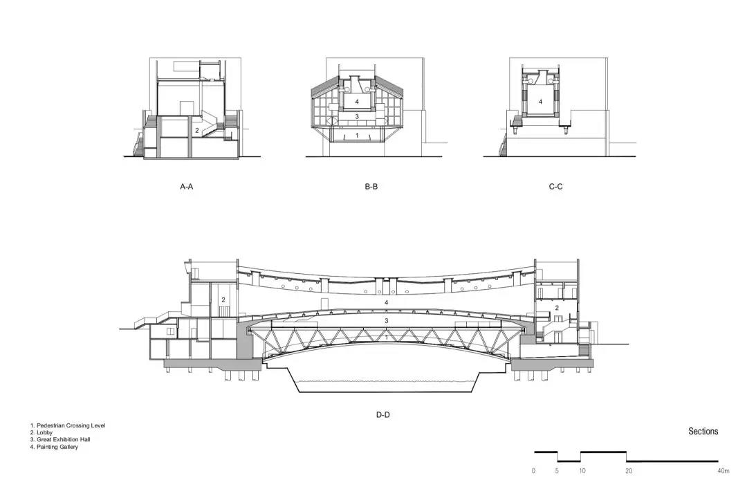 兩橋之間是一個由玻璃幕墻和筒瓦遮陽系統(tǒng)圍合而成的大展廳,用于舉辦臨時展覽。美術(shù)館的服務(wù)空間如門廳、行政辦公、商店和茶室則被安置在兩端的橋頭建筑內(nèi)。人們可以從任意一側(cè)河岸進(jìn)入美術(shù)館。