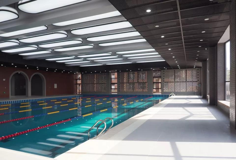 一樓的游泳館從西側門廳進入,由于與教學樓距離較近,入口位置設在門廳的南北兩側,朝向教學樓東入口的一面被設計成一面鏤空的磚墻,并通過磚的砌筑形成一幅山水畫卷,以隱喻徽州多山的地理環境。