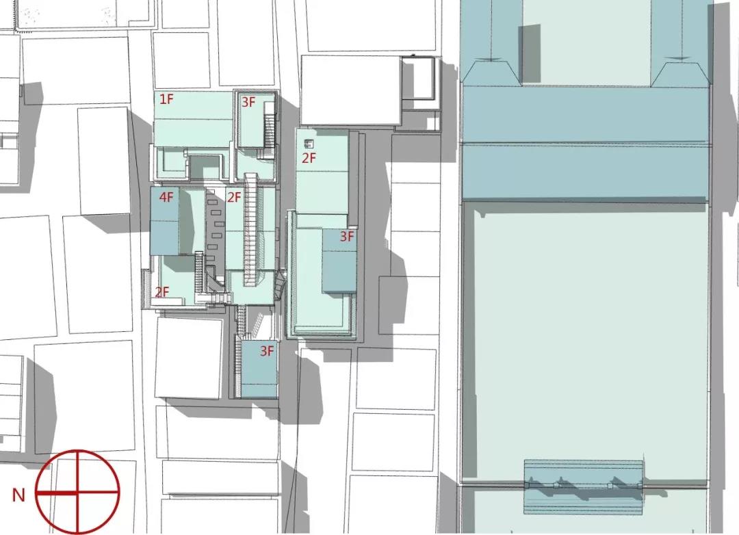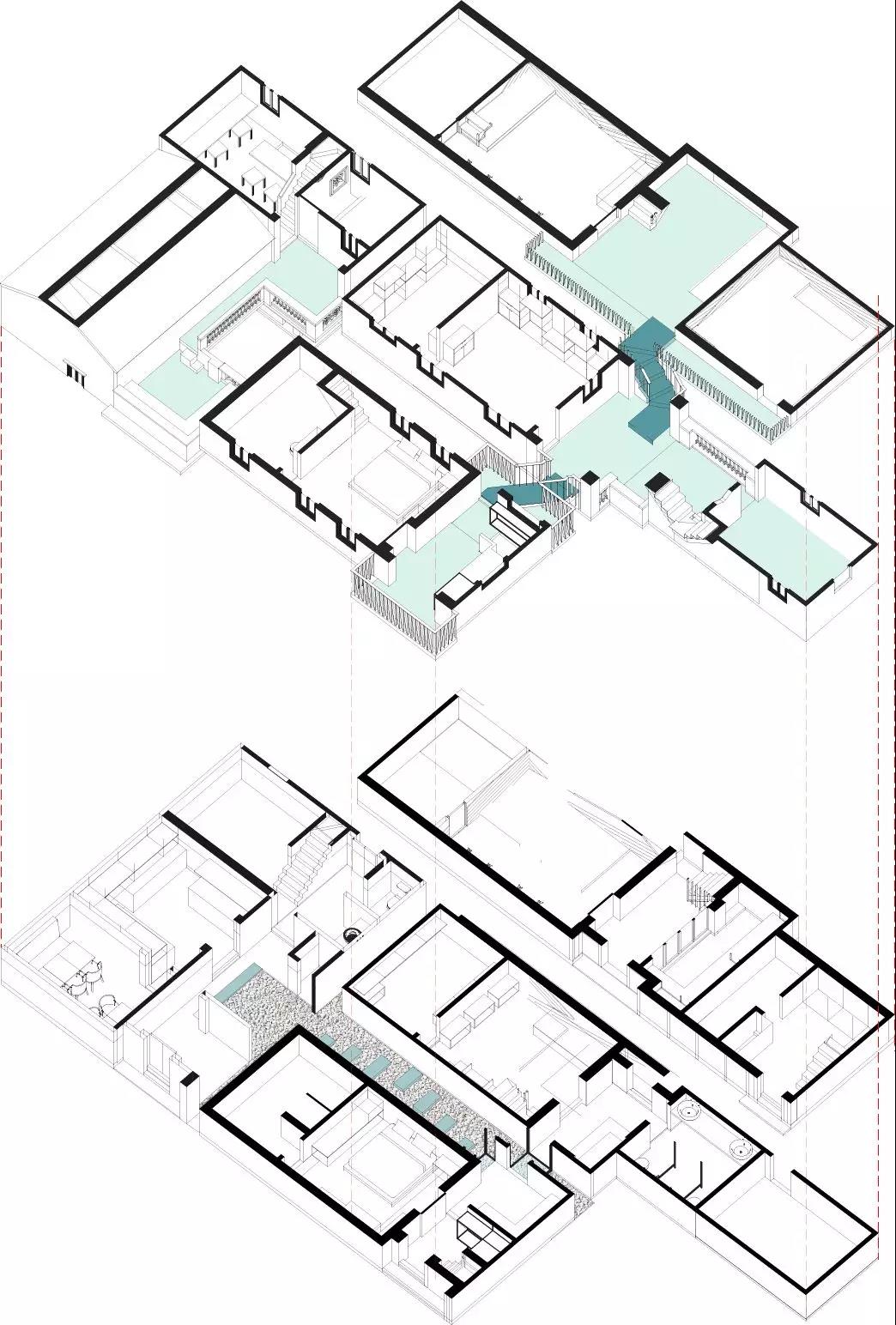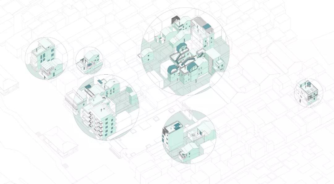 中國(guó)農(nóng)村原本是一個(gè)嚴(yán)格尊重土地所有權(quán)的社會(huì),這使得設(shè)計(jì)原本共享的概念難以實(shí)現(xiàn)。因此在整個(gè)社區(qū)的核心組團(tuán)的設(shè)計(jì)中,我們利用相鄰四棟被租賃下來的房子,打破房子間的圍墻、眾籌一個(gè)公共空間——將四棟房子的院子,附屬空間,過道空間,露臺(tái)空間等原屬于單個(gè)房子內(nèi)部的公共空間全部集合到一起,梳理出一個(gè)屬于大家的能適應(yīng)新的使用功能的公共空間體系,以解決整個(gè)白房子民宿社區(qū)缺乏公共活動(dòng)空間的難題,眾籌一個(gè)社區(qū)活動(dòng)中心。