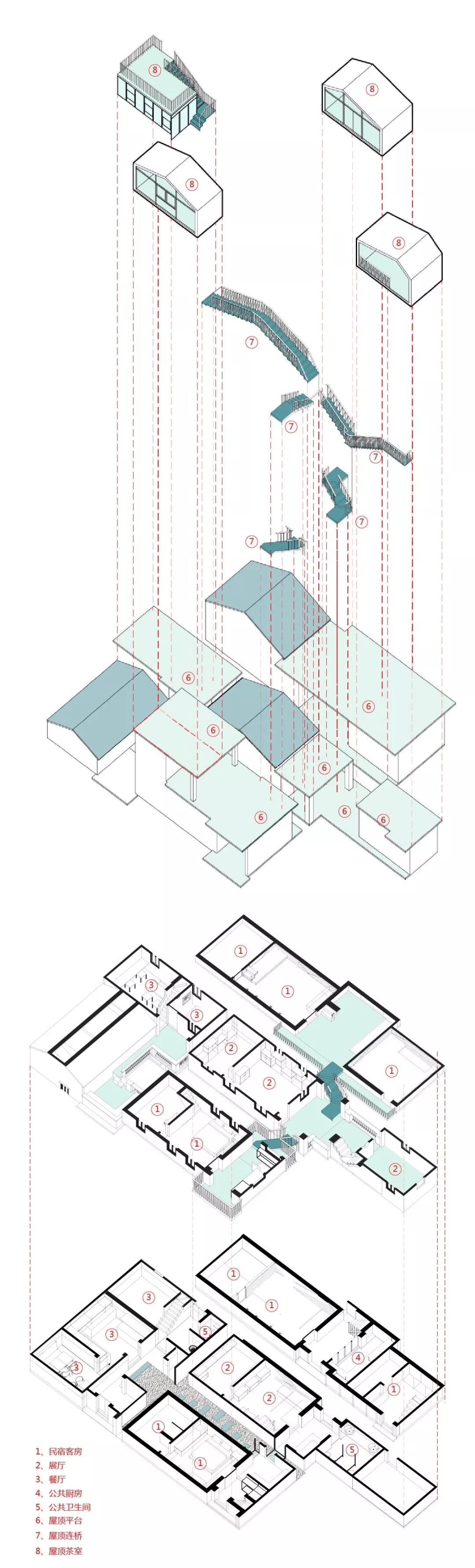由于這個(gè)天臺(tái)公共空間的存在,本地村民與外來住客有了更多的交集,彼此之間的交往更加融洽,設(shè)計(jì)師原本設(shè)想的散點(diǎn)式、共生式的舊村更新和民宿生活態(tài)度得到了很好的實(shí)現(xiàn)。
