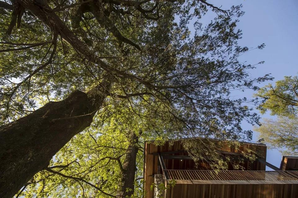 建筑背山面谷,臥于一方寶地,樹木遮掩,若隱若現,遠山美景可觀、百年古樟為鄰,透過不同的窗口,在不同的時間里,在不同的建筑高度,都是不同的風景,每一個層次都有不同的體驗,每扇窗口外都是整幅無框山野畫卷。
