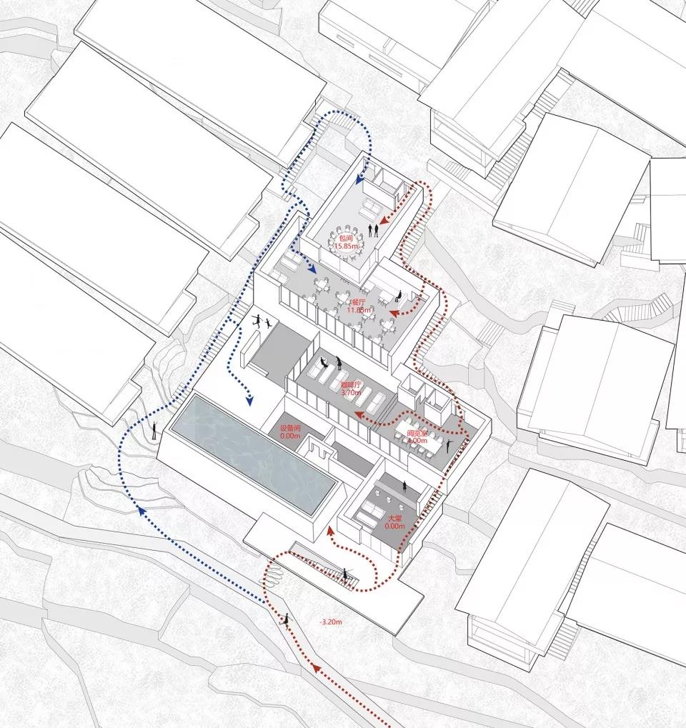 為此,團隊多次地去到現場踏勘測繪,對古樹與古道進行準確定位,不同臺地的原始標高反復確認,最終設計布局是在對無數種可能性進行嘗試之后,最契合于地塊的答案,以秉承最低程度破壞自然的原則。