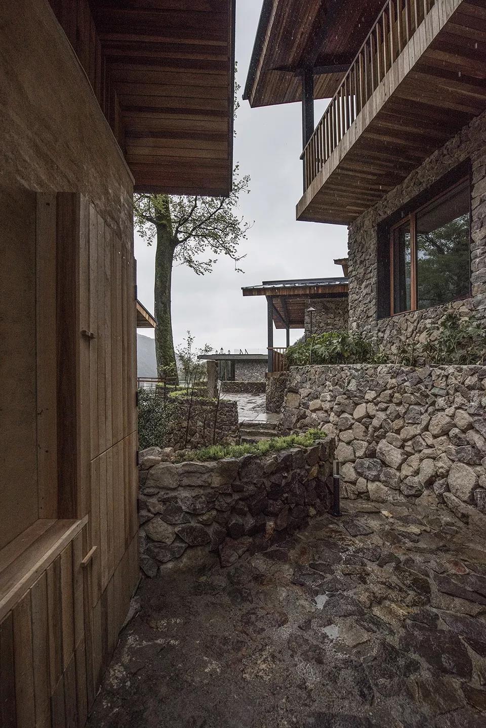 客房提取坡屋頂形制,材料以當地毛石和夯土為主,延續傳統生活與文脈。在這里,并沒有宏大敘事的建筑空間,也沒有昂貴繁復的材料做法,材料與形式的有機結合,每一棟山舍的夯土、壘石、小青瓦,是建筑材質、立面造型,更是山里的生活。