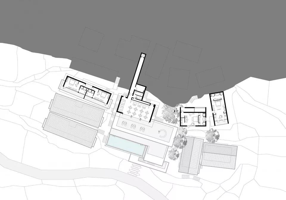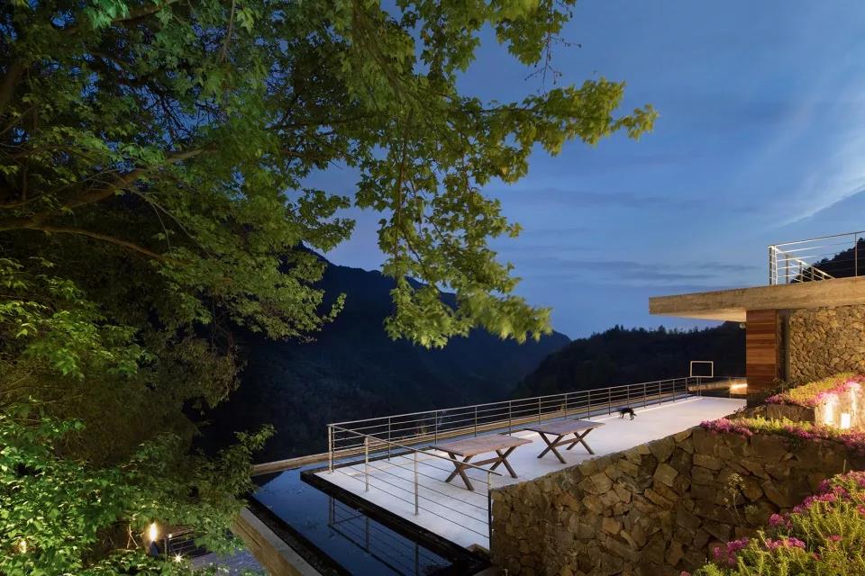 設計以一層或兩層的客房錯落有致地散落山間,四層的公區以片層形式貼合地形延展,弱化體量的同時,創造出一系列觀景露臺。各層建筑的頂面和地面與不同高度的山體銜接,層層展開,建筑如從山中生長出來,以最輕柔地方式貼合于山地,隱現于景觀。