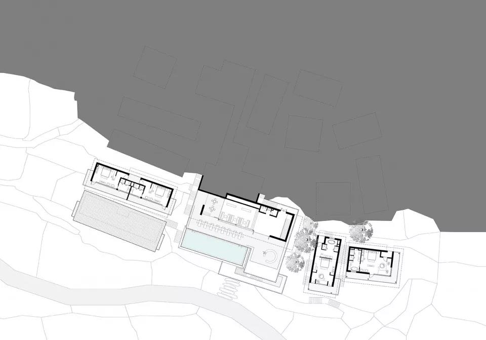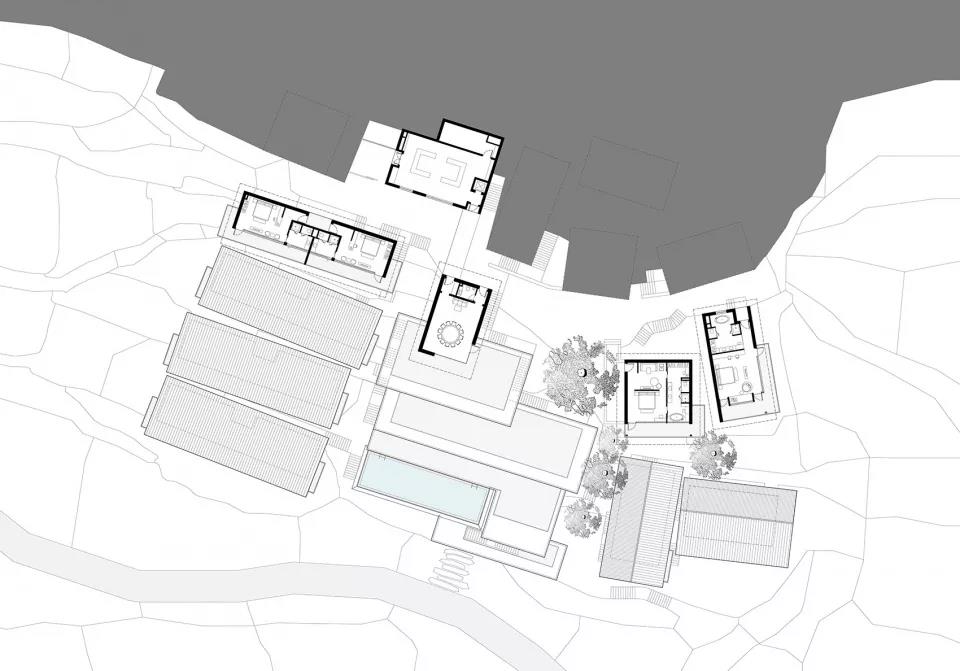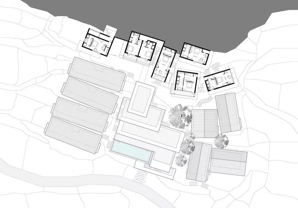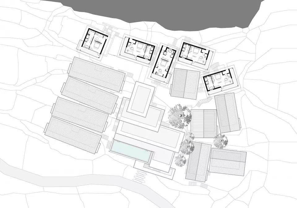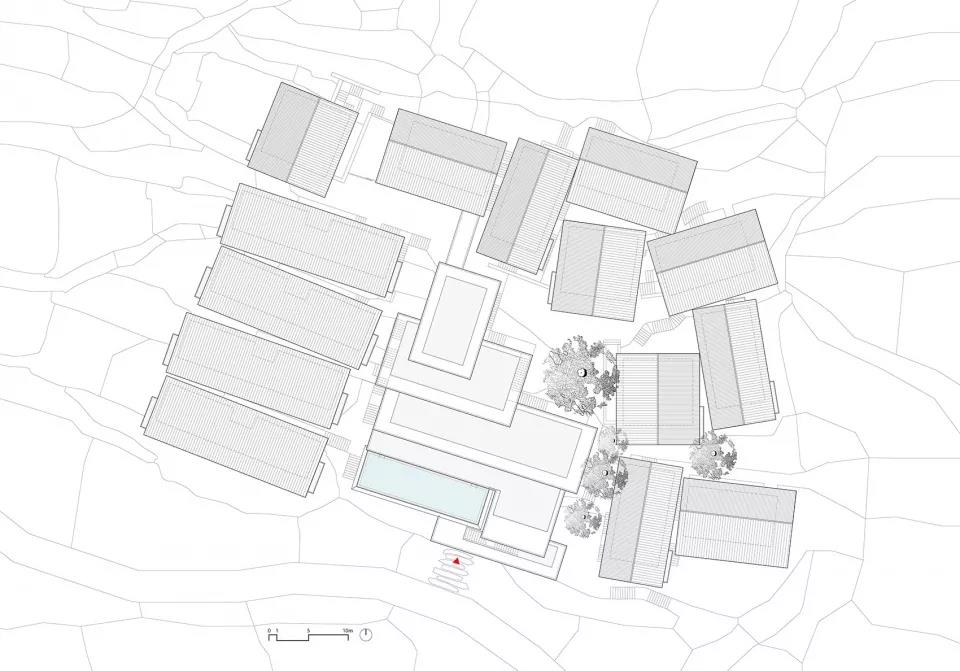 設計以類型學將公區、集中式客房和獨棟Villa三種功能空間模塊化。避開古樹,置入各功能模塊。依據原始地形,模塊以最大可能放置在原始臺地標高上。公區層層疊退,客房化整為零,化解建筑的體量感。再依據等高線走向、景觀、視野的不同進行高度和角度的微調,保證隱私性的同時實現最大化的景觀體驗。