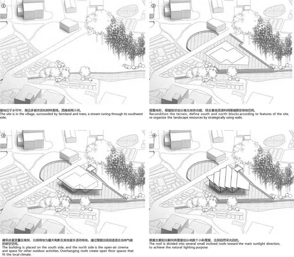 我們把南北地塊作為一個整體考慮,南側、東側設磚砌矮墻,向西北側山體打開,形成場地空間界定。村路東北側磚墻與混凝土鵝卵石鋪地圍合出半月形廣場,考慮為露天電影放映等多功能活動使用。