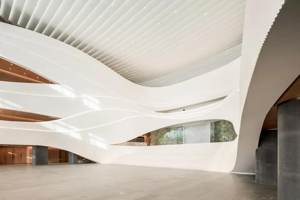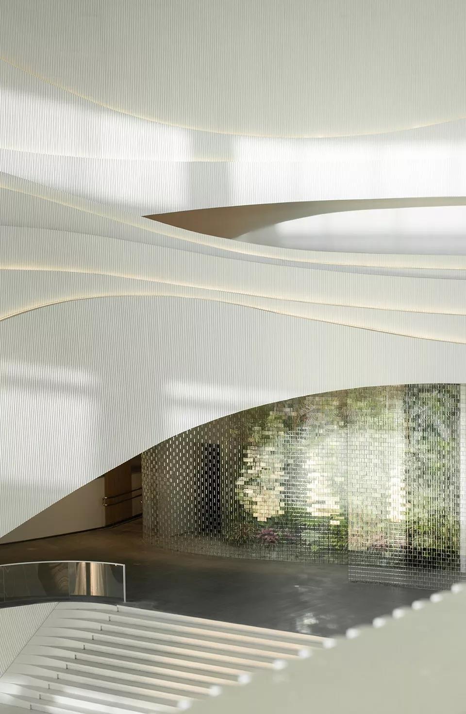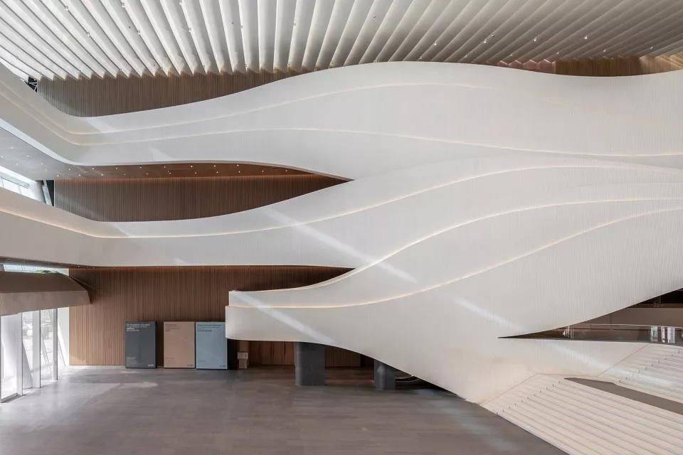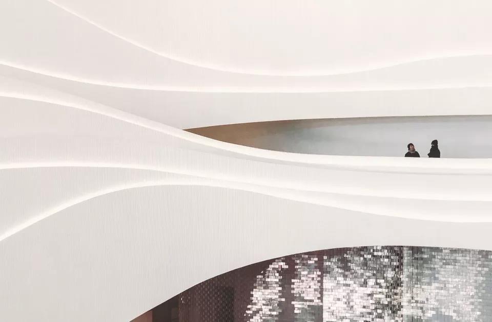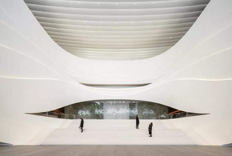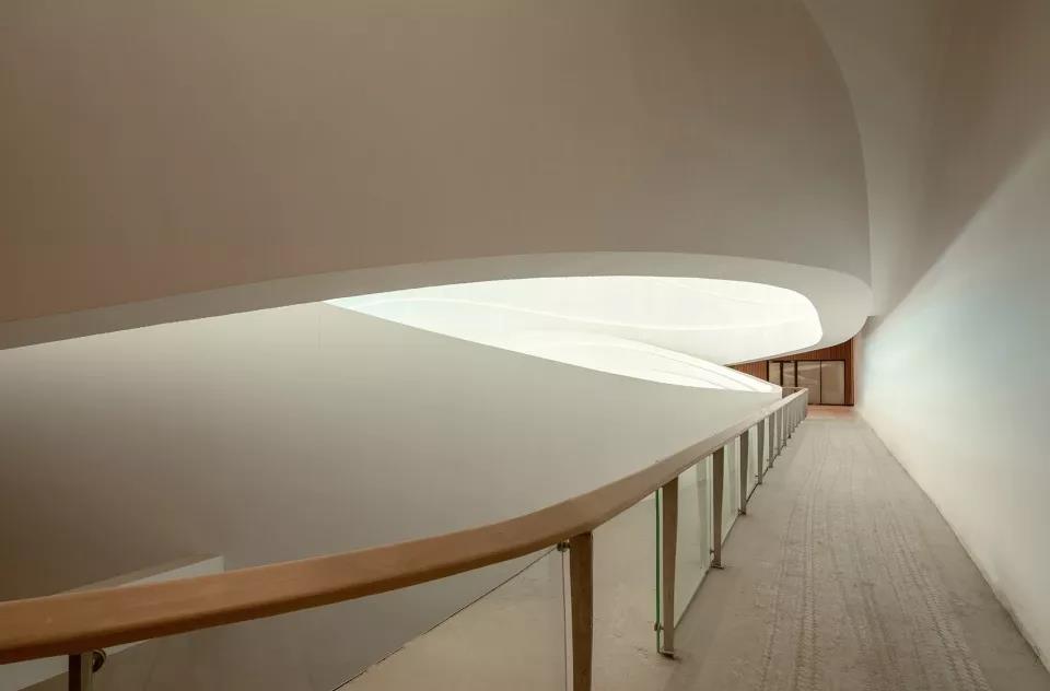 美術館部分建筑面積約10,000平米,由分布于大廳兩側的展廳空間組成,我們希望這個美術館成為城市生活中活躍的場所,盡可能的打破固有建筑平面的局限,為人們提供了一個富有詩意與想象的空間,若干可供休憩與交流的公共空間圍繞著充滿自然光影的中庭重塑了觀展流線,并隱藏于自然流暢的立面中;建筑師在中庭設計中巧妙的延伸了劇院中看與被看的空間關系,使表演活動不再局限于舞臺,使之貫穿于整個文化綜合體中,豐富了觀覽體驗。