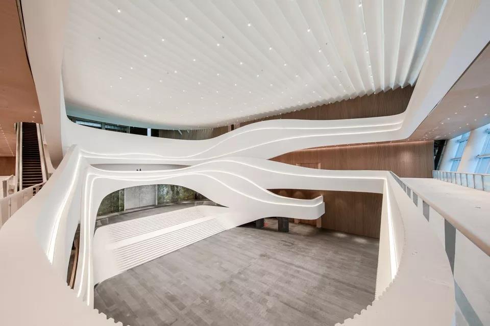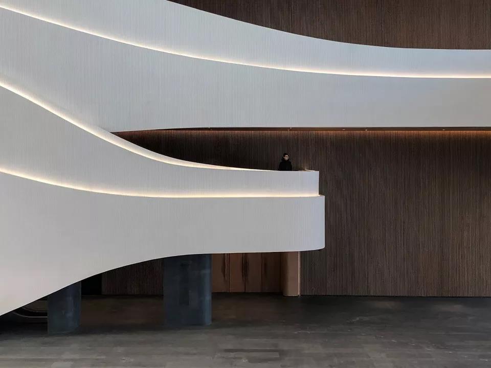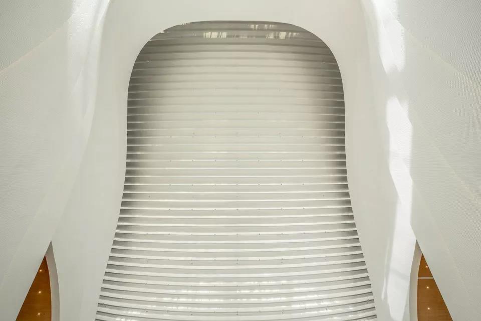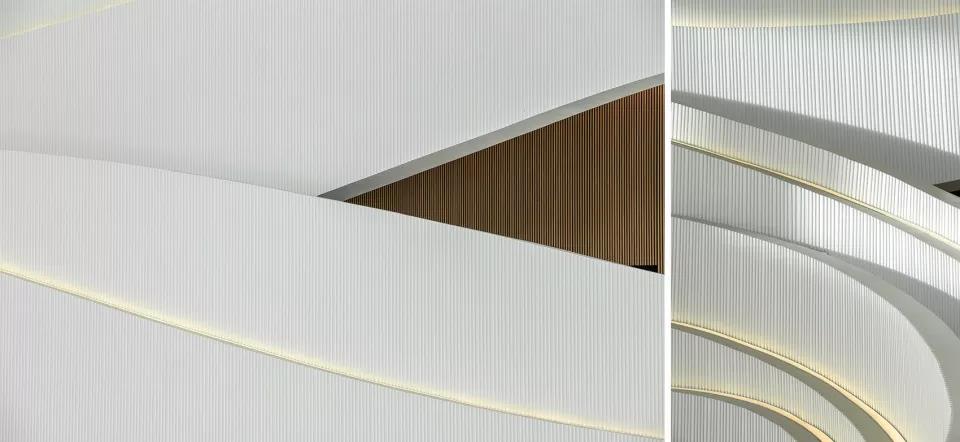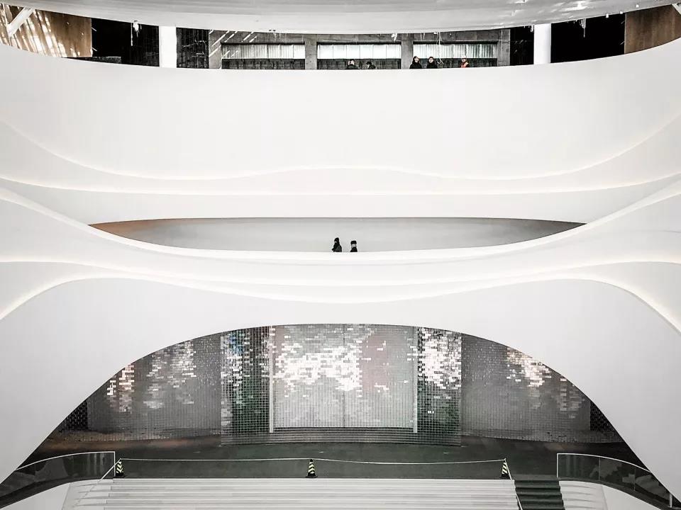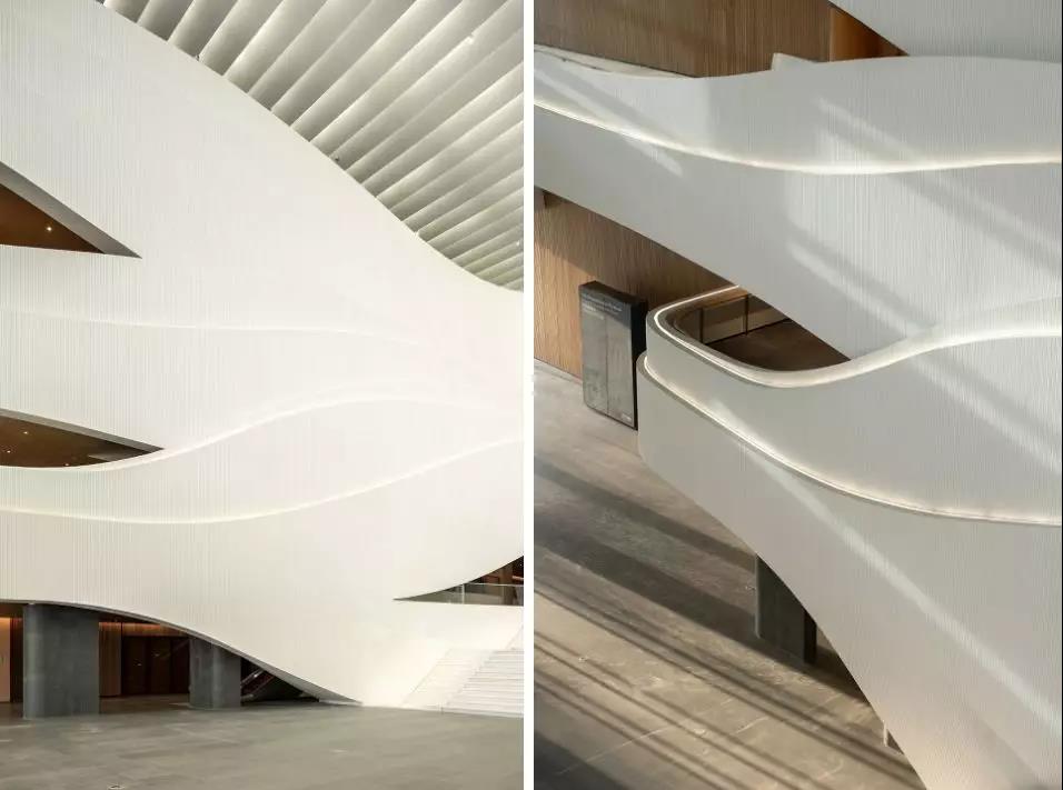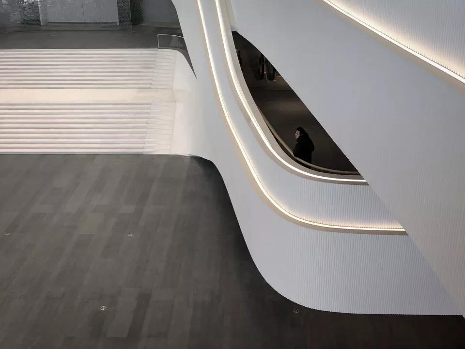 美術館部分建筑面積約10,000平米,由分布于大廳兩側的展廳空間組成,我們希望這個美術館成為城市生活中活躍的場所,盡可能的打破固有建筑平面的局限,為人們提供了一個富有詩意與想象的空間,若干可供休憩與交流的公共空間圍繞著充滿自然光影的中庭重塑了觀展流線,并隱藏于自然流暢的立面中;建筑師在中庭設計中巧妙的延伸了劇院中看與被看的空間關系,使表演活動不再局限于舞臺,使之貫穿于整個文化綜合體中,豐富了觀覽體驗。