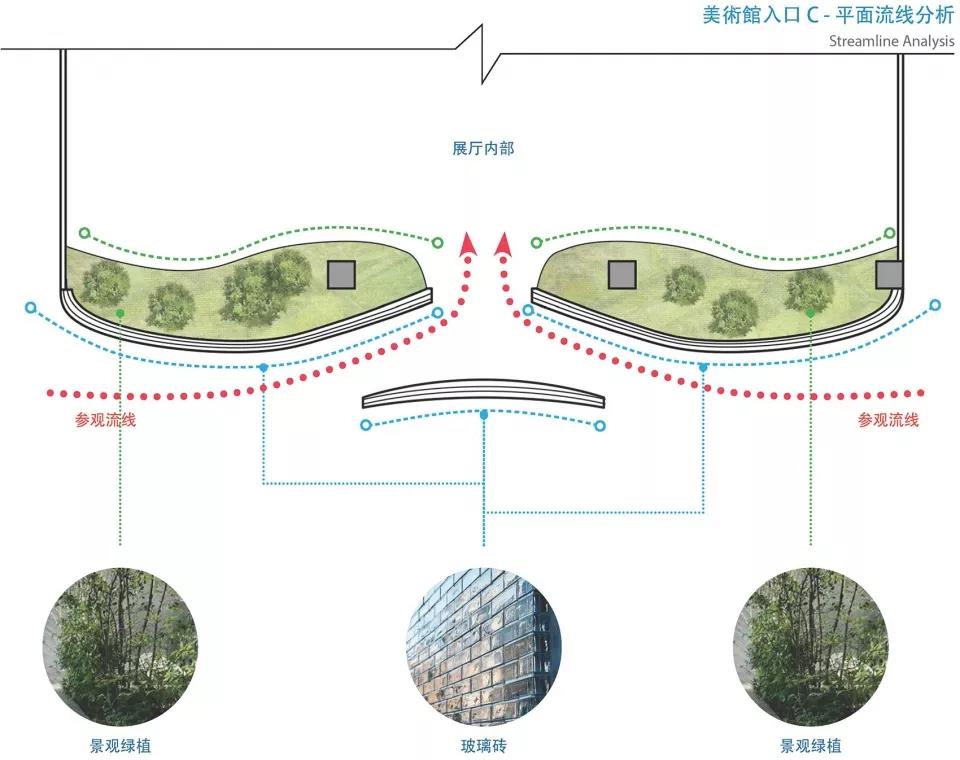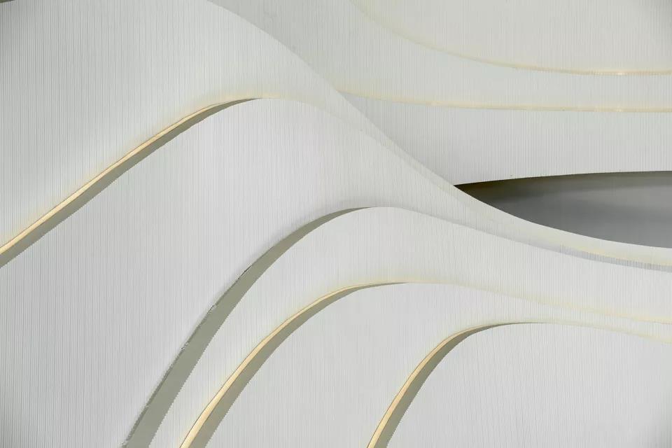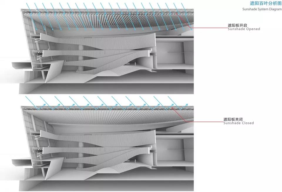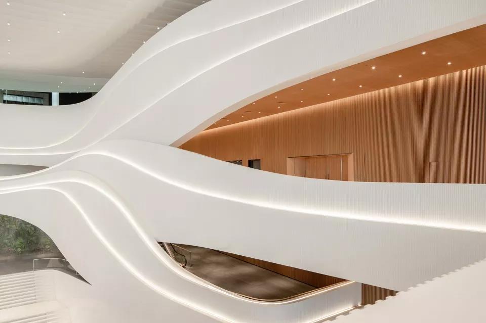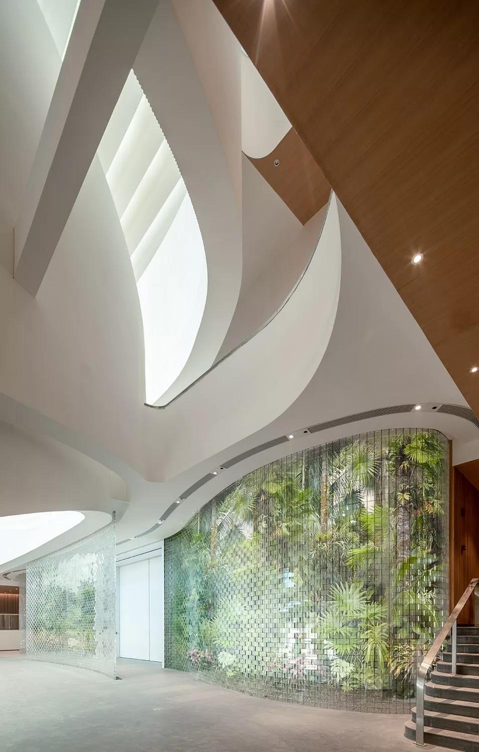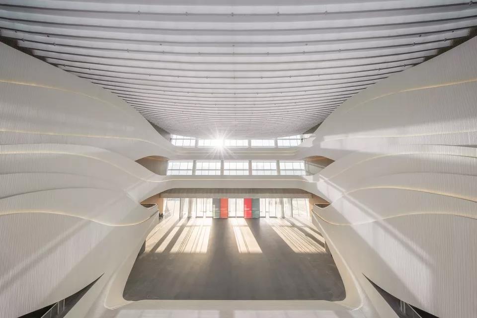 美術館部分建筑面積約10,000平米,由分布于大廳兩側的展廳空間組成,我們希望這個美術館成為城市生活中活躍的場所,盡可能的打破固有建筑平面的局限,為人們提供了一個富有詩意與想象的空間,若干可供休憩與交流的公共空間圍繞著充滿自然光影的中庭重塑了觀展流線,并隱藏于自然流暢的立面中;建筑師在中庭設計中巧妙的延伸了劇院中看與被看的空間關系,使表演活動不再局限于舞臺,使之貫穿于整個文化綜合體中,豐富了觀覽體驗。