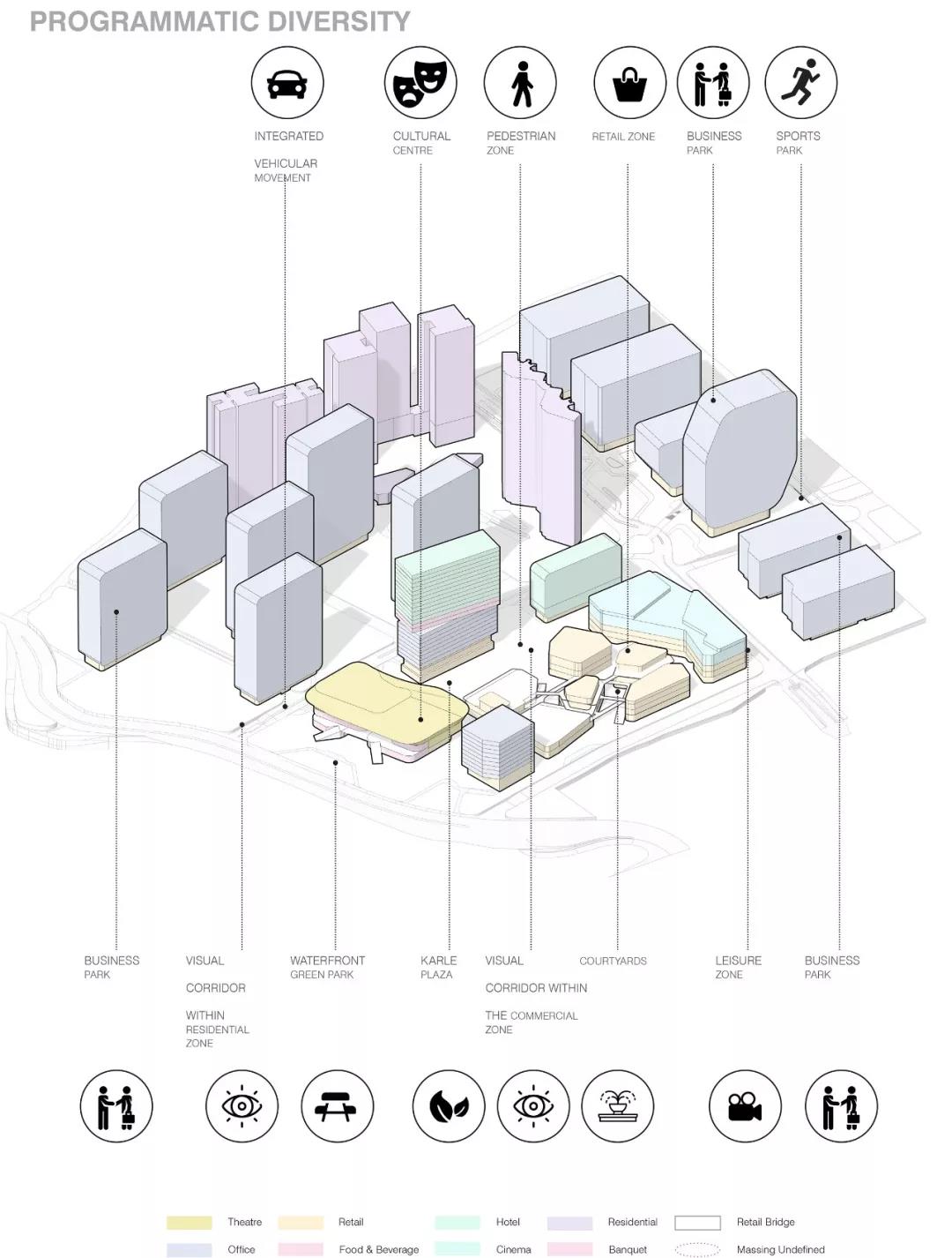 總體規劃的目的是要讓每棟建筑都變成“自己繁榮的城市縮影”?!皬母旧险f,對于商業來說,該項目還提供了一個工作、生活和娛樂的環境,以確保各種用戶在白天和晚上都有活動??傮w規劃的文化支柱包括中央大劇院、活動廣場廣場和一座高架鐵路候車平臺。