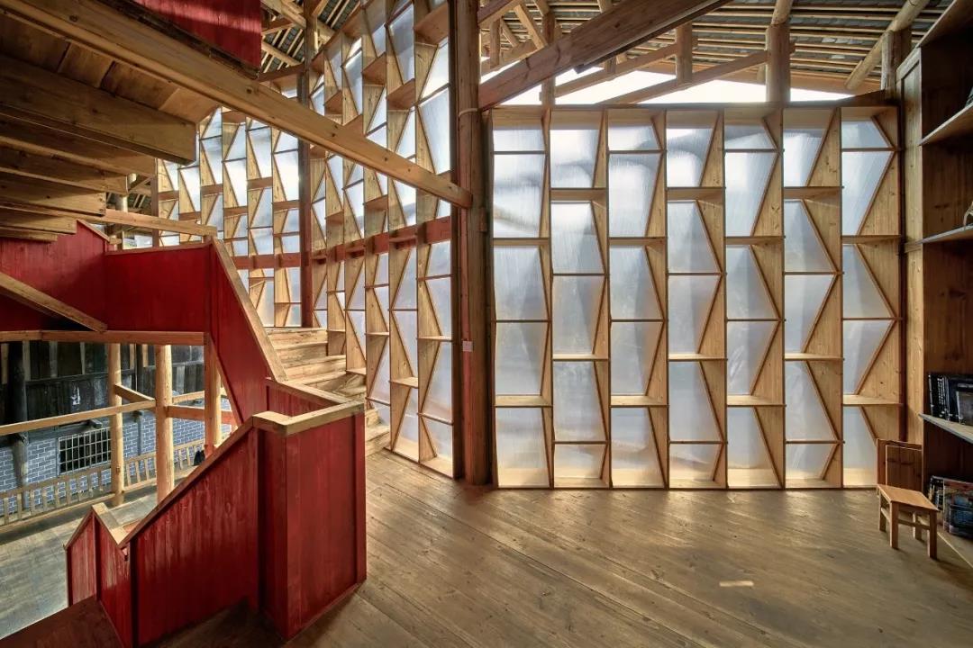高步書屋面積約二百平方米,主要由木屋架組成。底層中心處貫通整座書屋的樓梯,是它的標(biāo)志性元素。書屋底層的開放空間讓村民可以休息,或者舉辦展覽和其他活動(dòng);二層和三層則由不同主題的圖書書架構(gòu)成外墻,樓梯的設(shè)計(jì)緊貼著由半透明陽(yáng)光板構(gòu)成的書屋立面。