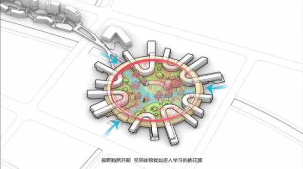 融合共生是我們設(shè)計太倉校區(qū)時秉持的核心設(shè)計理念,也是對德勒茲社會及知識結(jié)構(gòu)發(fā)展理論的應(yīng)用,設(shè)計中我們以圓環(huán)串聯(lián)起一系列的教學、科研、產(chǎn)業(yè)、配套等建筑,形成綜合而扁平化空間組合,旨在創(chuàng)造一座桃源中的校園。圓環(huán)界定了內(nèi)外空間關(guān)系,外部空間是面向城市的,內(nèi)部空間則是創(chuàng)造了一個桃花源的世界,形成內(nèi)外的對比。