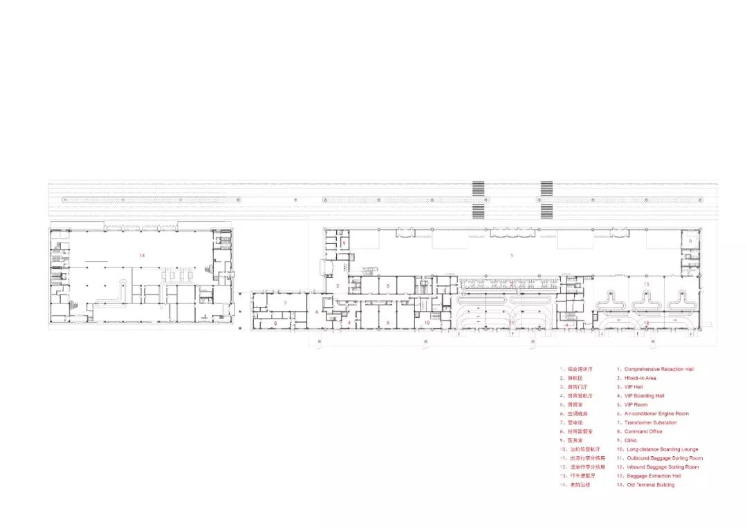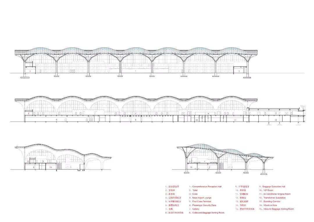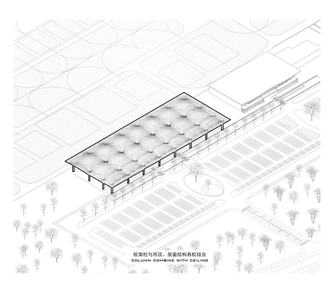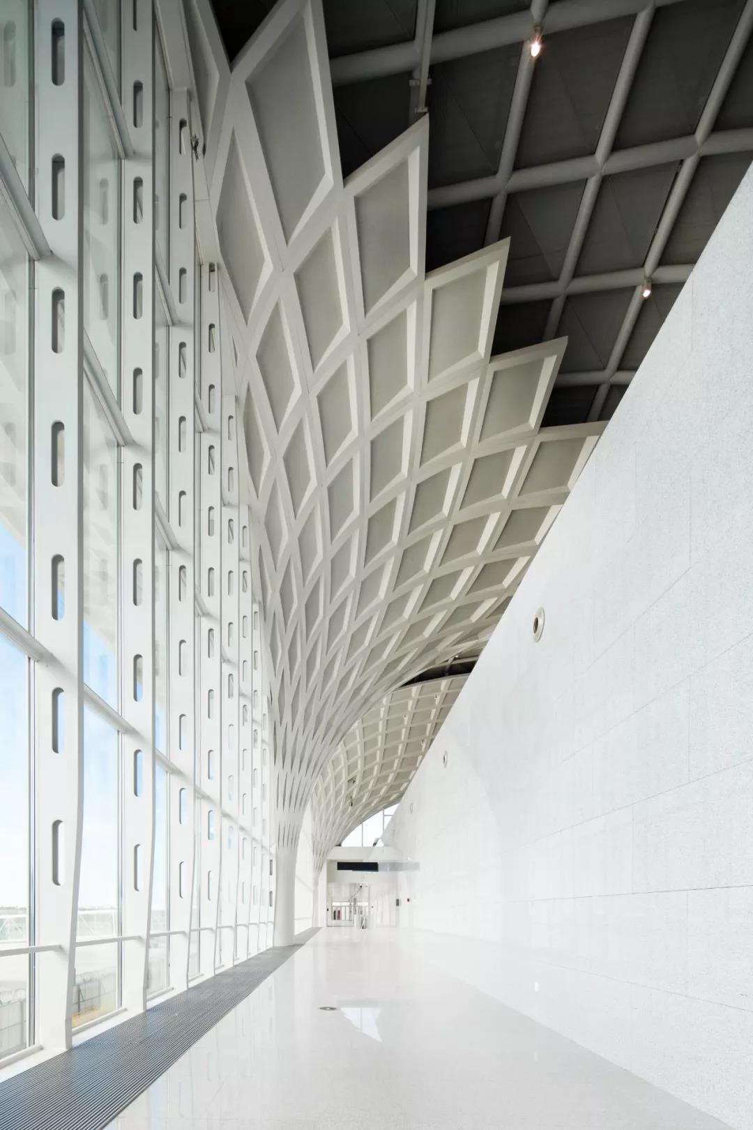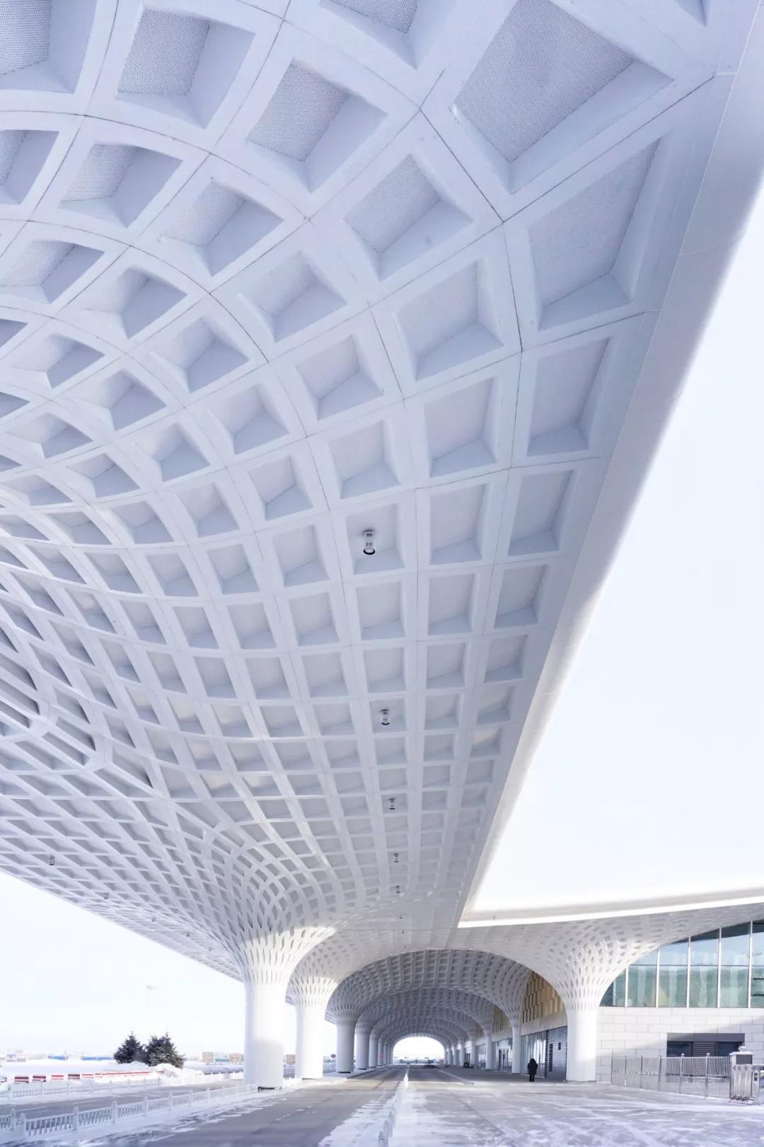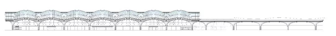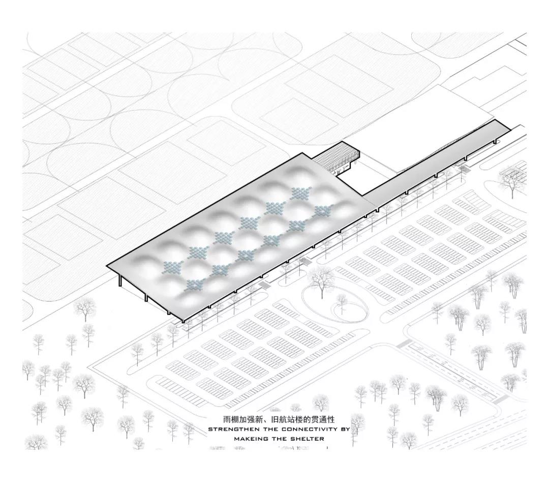 綿延的雨棚成為連接新老航站樓的重要元素,形成統一建筑語言,加強了新、舊航站樓前車道和等候空間的貫通性,創造了怡人尺度的室外灰空間。