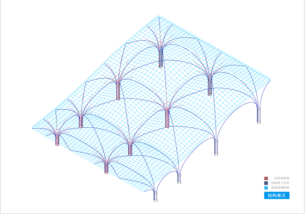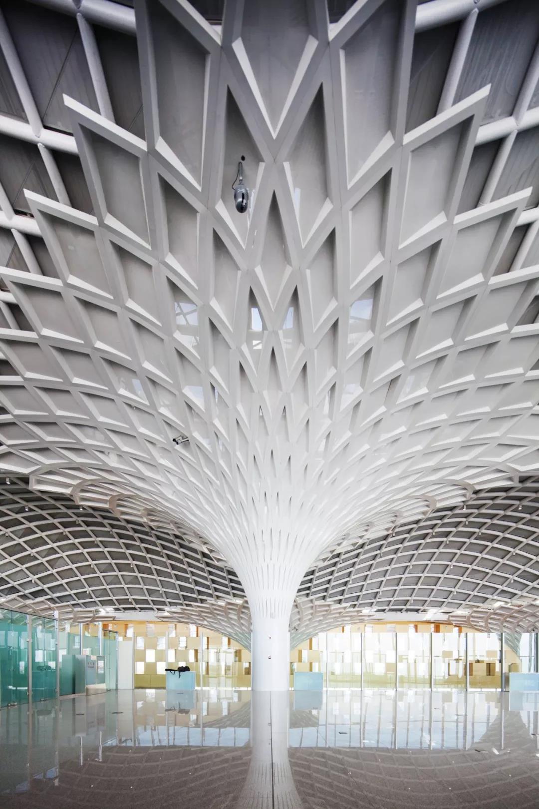 考慮到建造難度,將縱向7跨的航站樓的主體結構、屋面、內裝整合成兩跨的基本單元。以屋面網架結構的尺寸作為基本模數,對鋁板的曲率、曲面進行分析和歸類:曲率較小的簡化為平面鋁板,曲率略大的簡化為單曲面鋁板,極少數曲率較大的為雙曲面鋁板,進而將工藝難度和造價控制到最低。