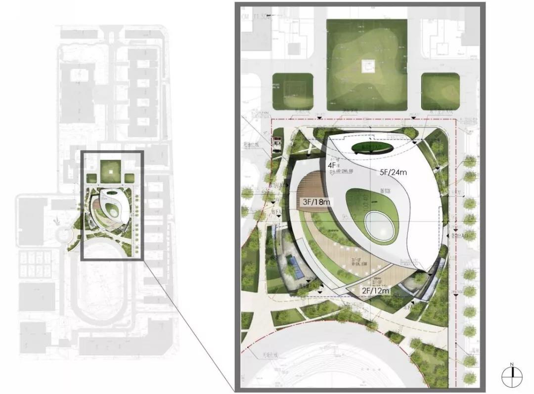 北側圖書館主入口作為校園中軸線終點的背景,與校園肌理完美結合。在圖書館中心是層層退進的橢圓形主中庭,通過特色旋轉樓梯宛若燈籠花蕊,成為整個建筑的核心。
