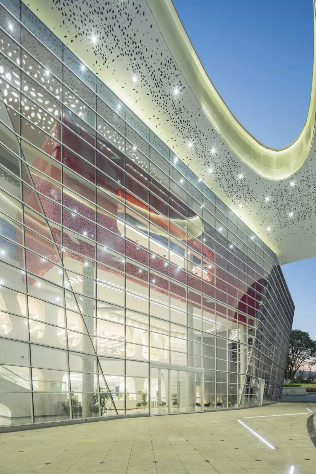 圖書館形態源自燈籠花優雅的外形,北側和東側以實體墻面為主,宛若花朵枝葉包裹;西側和南側是如燈籠花瓣晶瑩剔透的玻璃幕墻。幾條流動的曲面勾勒出花朵的動感形態,與其周圍教學樓、宿舍樓相映成趣,成為整個校園的地標和視覺焦點。
