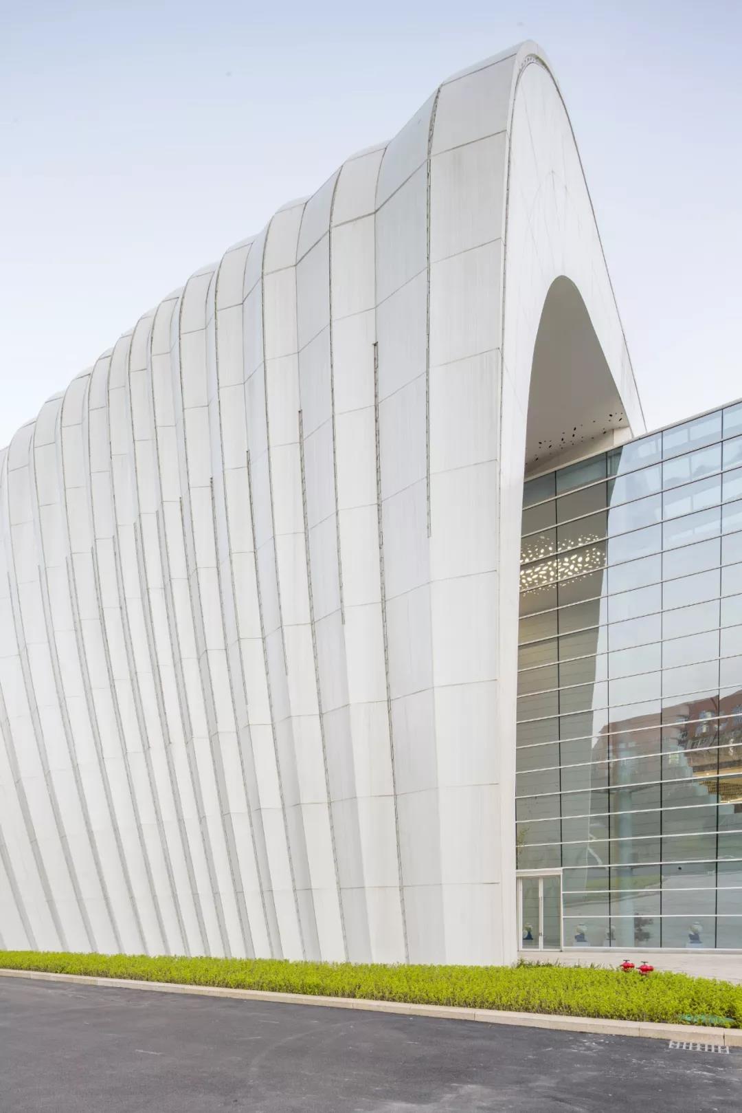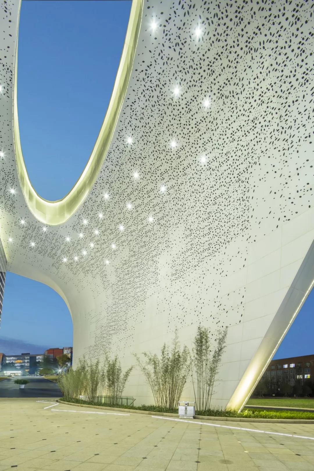北側屋蓋外部全采用鋁板的材質,每塊鋁板都是平行四邊形,通過平面上角度的變化形成鋸齒形的平面效果,在陽光下形成豐富的光影變化。細節設計上,在每兩組鋁板相交的陽角處設置長短不一的LED燈帶,兩塊鋁板交接處預留豁口,豁口處設置透明亞克力板內藏LED燈帶。夜晚形成如瀑布般的效果。