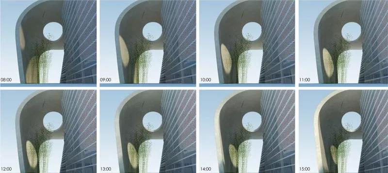 在建筑北側和西南側設置圖書館入口,東側設置貨運入口,空間組織注重建筑空間的趣味性,在建筑的西南側設置下沉廣場,有效的利用了地下空間,巧妙的解決了地下空間出入口問題。