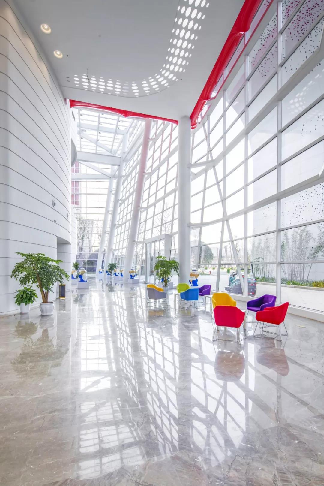室內設計將建筑設計元素和“書”圖形元素相結合,豐富其內涵,把建筑設計語言延伸至室內空間,達到融合和統一,營造輕松愉悅、溫馨舒適的閱讀和交流空間。北側主入口大廳高18米,用簡約的線條勾勒出優美的曲線,紅色膜結構“燈籠”突出空間的視覺引導和焦點。