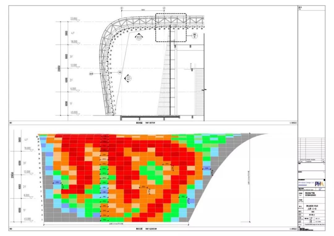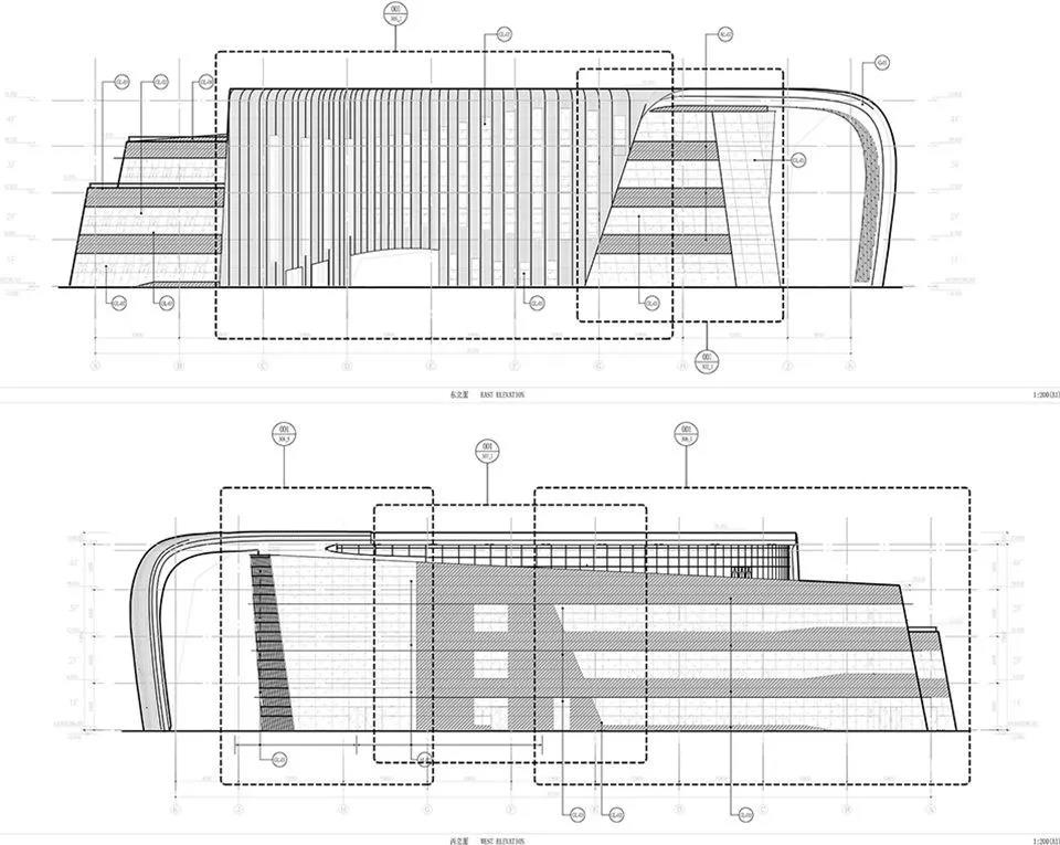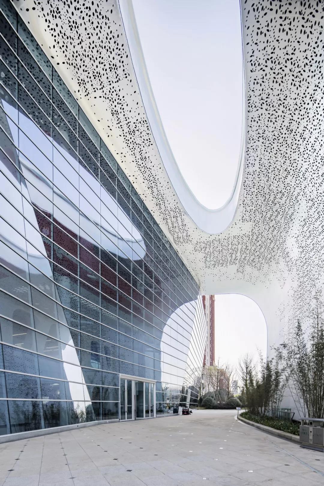 西立面面向科技館,功能以閱覽空間為主,通過玻璃幕墻和穿孔鋁板條形成水平向的變化,起到遮蔽直射光的作用;穿孔鋁板密度從北向南由疏變密;屋頂造型舒展有利,形成起伏的特色。東立面面向學生宿舍,功能為圖書館服務盒,通過鋁板和條形窗形成簡潔的立面效果。