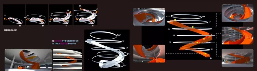 層層錯落的中庭與螺旋樓梯結合在一起,形成了極富動感的中庭空間。不同于傳統圖書館單一的知識傳播,現代圖書館更加強調空間的共享和信息的交流,沿著室內中庭螺旋上升的樓梯串聯起各層空間。
