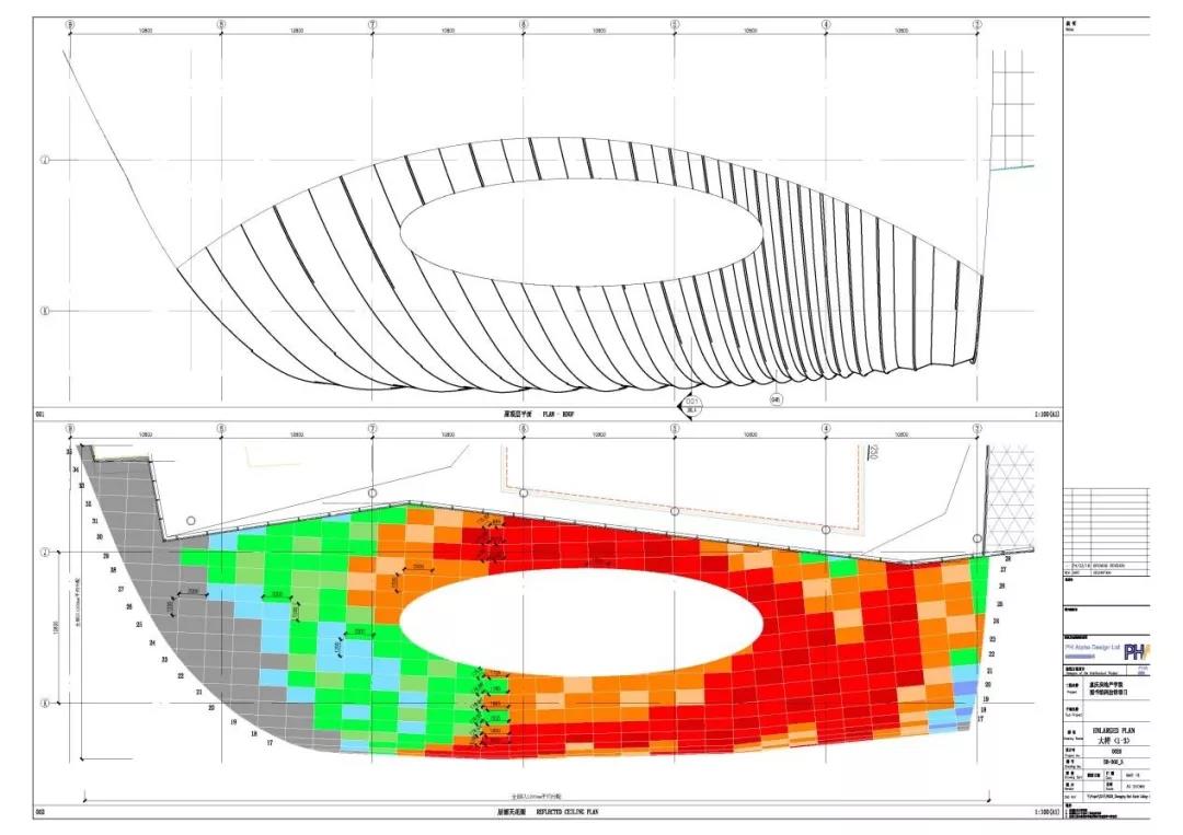 大屋蓋的內部,我們采用“星空”的概念來隱喻辛辛學子探索未知世界。屋頂的橢圓形洞口如同星系的中心,星光環繞中心形成星系的圖案,越靠近洞口星光越密集。為了完成這樣的設計意圖,我們采用“花瓣”和“圓形”的母題,通過疏密的變化,設計了四種圖案在穿孔鋁板上面,通過精心的設計布置,形成了“星云”般的圖案。所有鋁板都是以2000mmX1200mm的長寬尺寸作為標準件進行拼接,其中包括四種圖案的穿孔鋁板與一種不開孔的實面鋁板,共五種圖案組成北側屋蓋內表面的圖案。