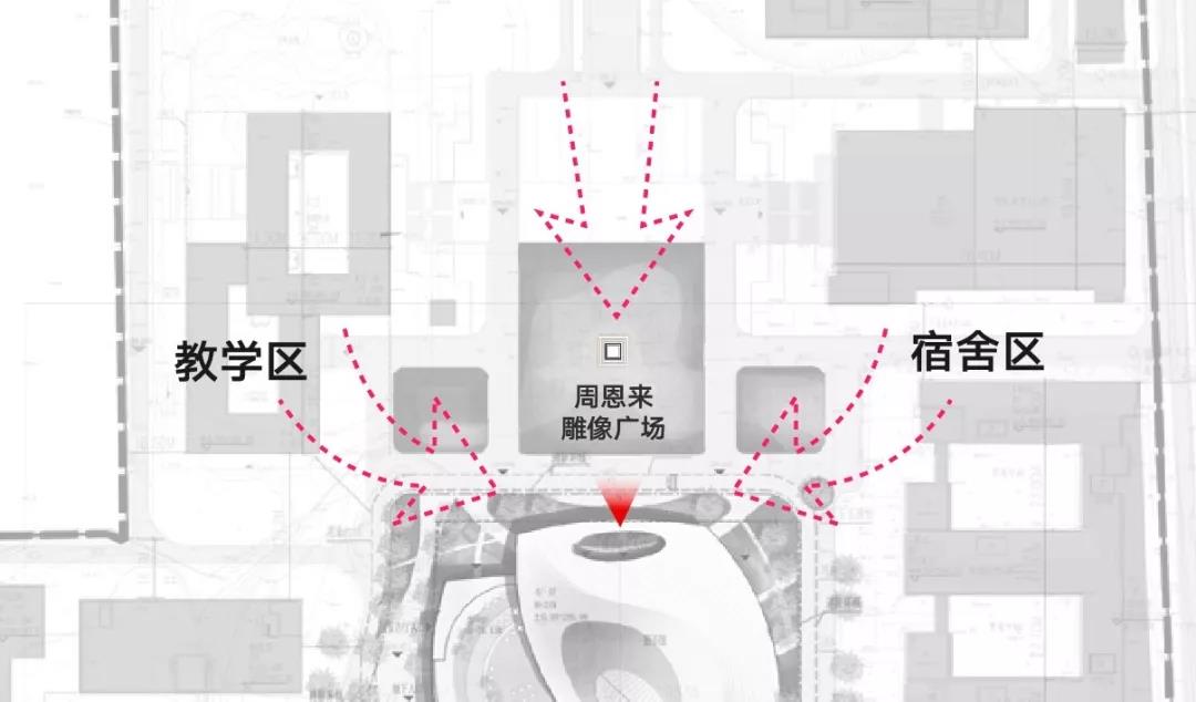 圖書館通過玻璃幕墻、穿孔金屬板相結合,形成各立面的特色:北立面面向主軸線和周恩來雕像,運用中國古典建筑“影壁”的概念形成進入圖書館的“過渡空間”,同時成為周恩來塑像的背景,起到更好的烘托作用。南立面正開闊的運動場,西側以穿孔版和玻璃為主,形成水平向的包裹效果,同時提供較好的視線廊道。