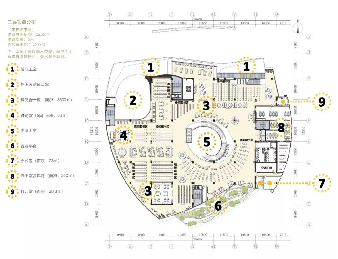 各層功能分布充分考慮現代圖書館的開放和高效性特點及新技術、新管理方式的采用。圖書館平面布局緊湊而有條理,交通組織便捷通暢,在分布藏書區、藏閱一體區、閱讀區、休閑閱讀區、私密閱讀區、交流探討區時,考慮到各功能分區之間的關聯、管理和查閱的便捷與高效性。