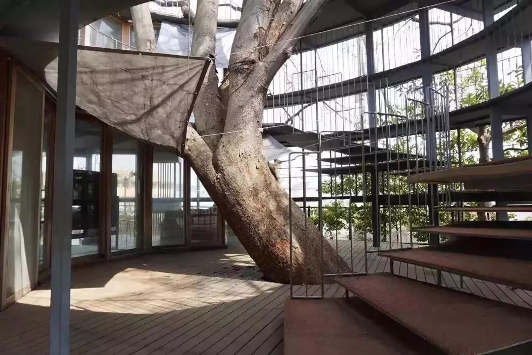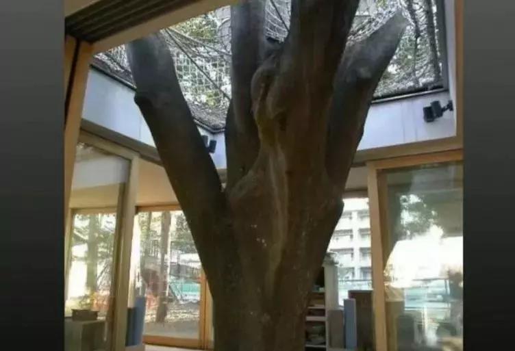你看,一棵樹從地下貫穿教室,一直長到屋頂外面。