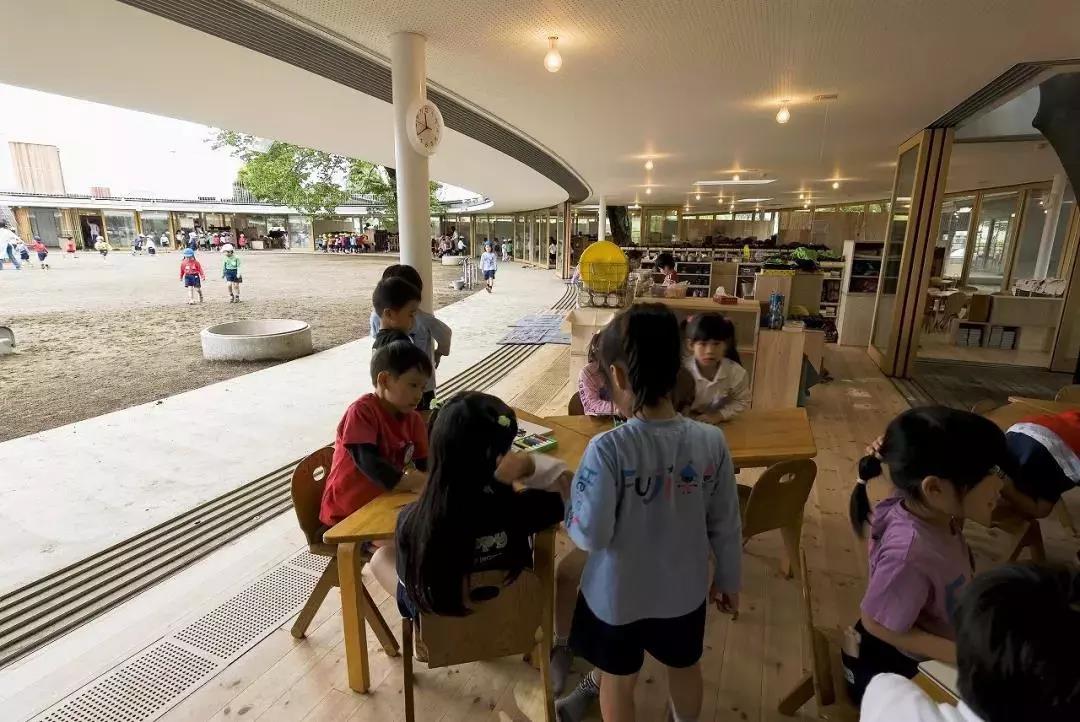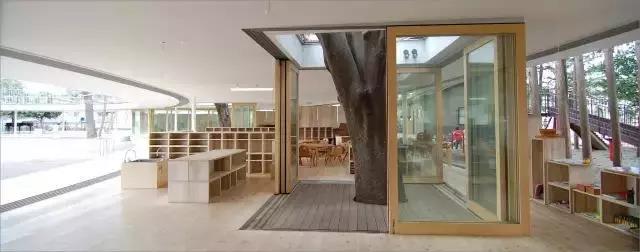 這所幼兒園沒有任何界限,室內和室外也只是用巨型的玻璃滑動門來分割,滑動門常年打開,孩子們能自由地穿梭于室內室外。