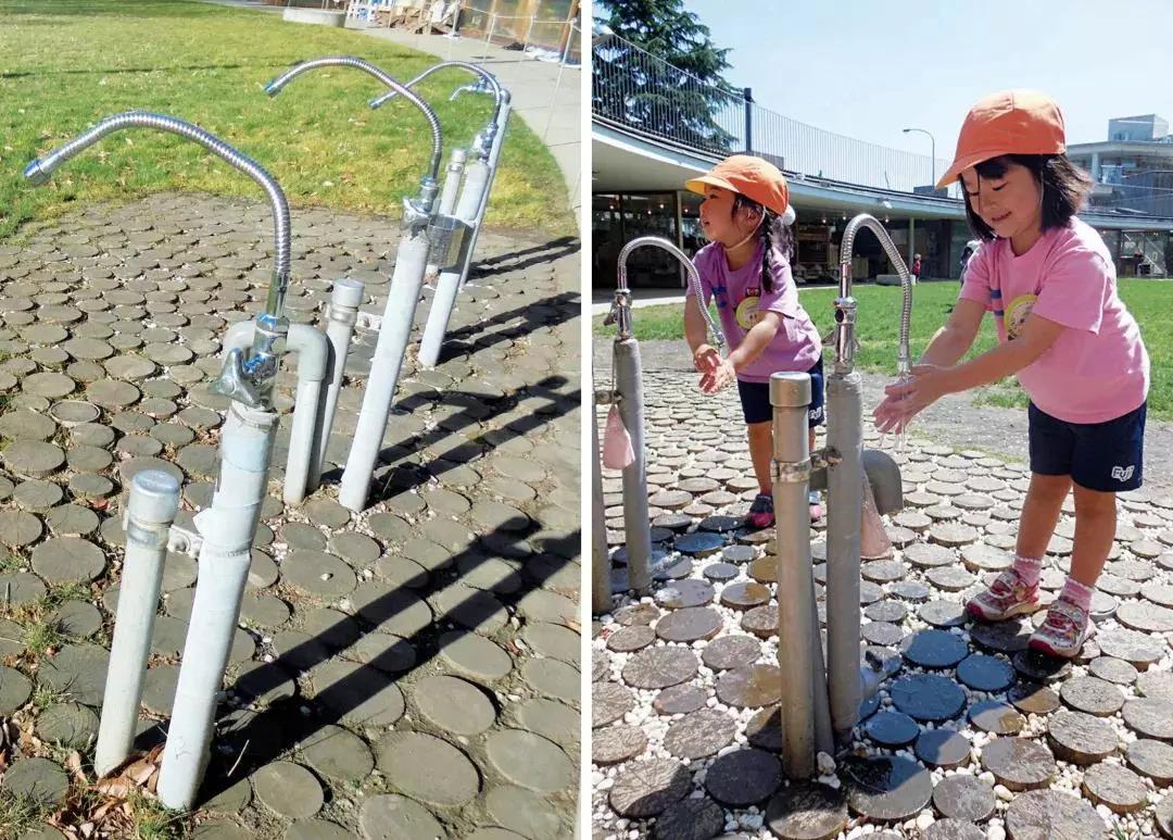 藤幼兒園的水龍頭也很特別,伸手不會自動有水出來,需要孩子們親自擰開。水龍頭下面沒有水池,如果不關水龍頭,水就會濺到小朋友的身上,這樣他們會下意識地關閉水龍頭,節約水資源。
