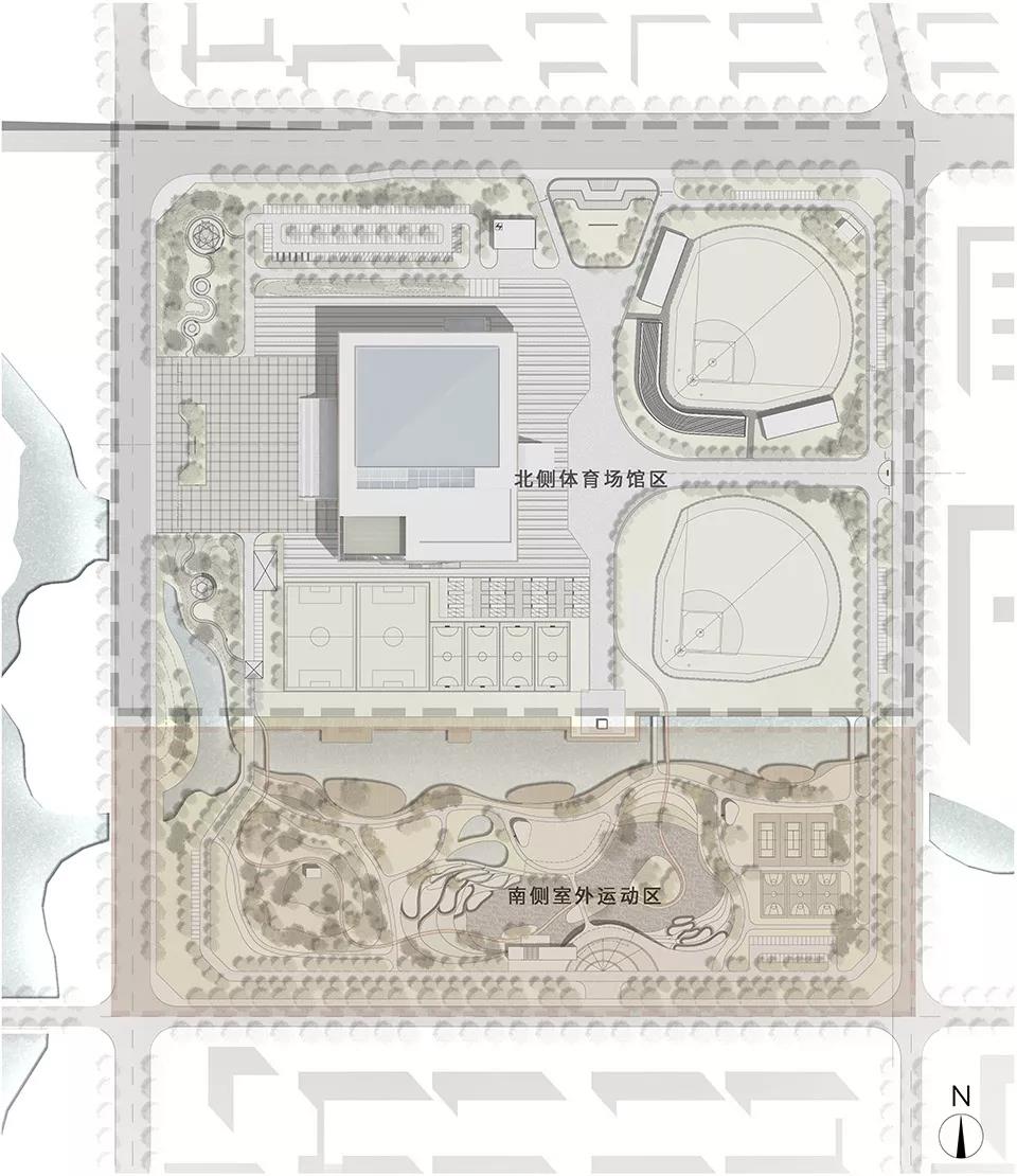 以場地中原有的水系及古運河為界,場地被自然劃分出南北兩個區域:以高效利用為原則、硬質場地為主導的北側體育場館區,和以順應自然為原則、景觀地景為立意的南側室外運動區。