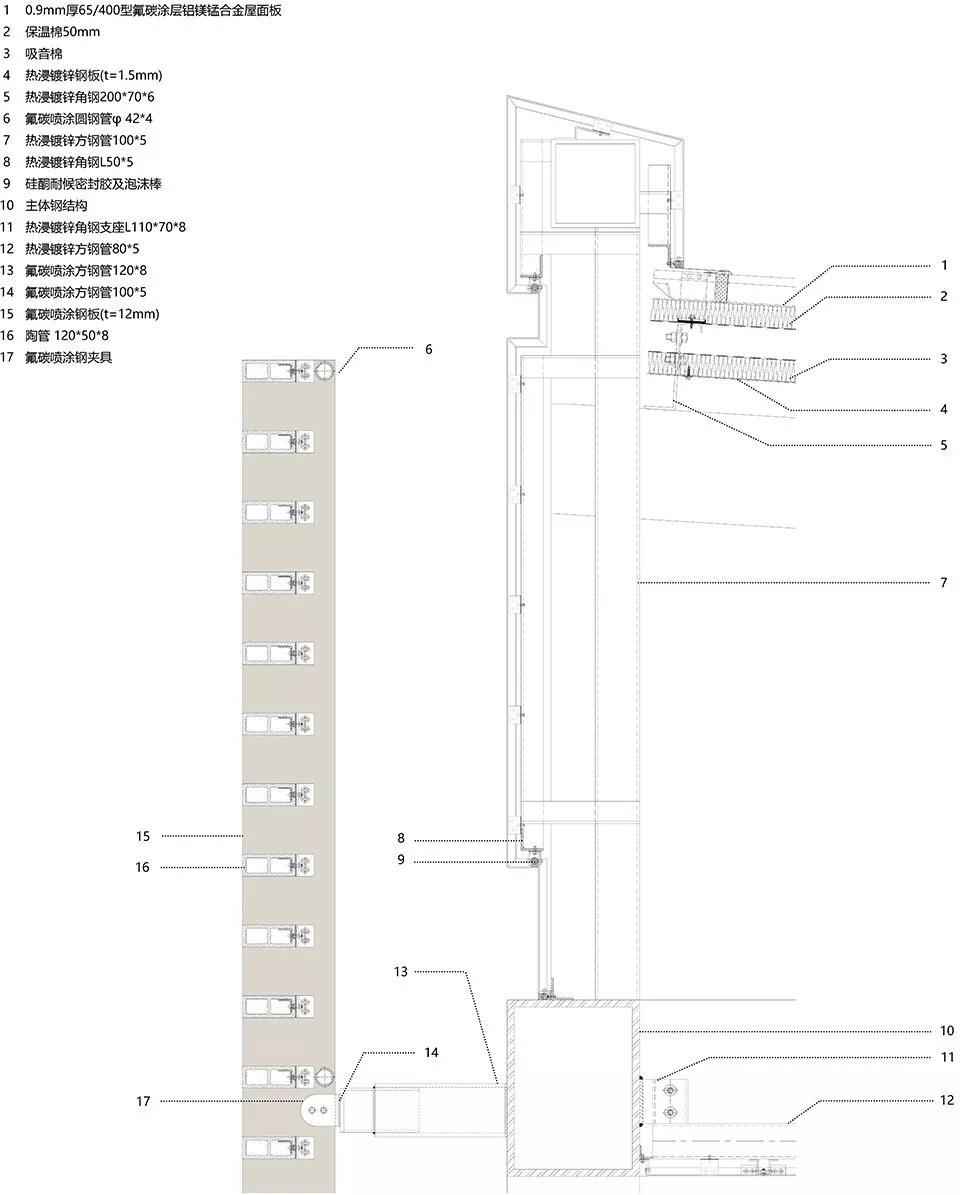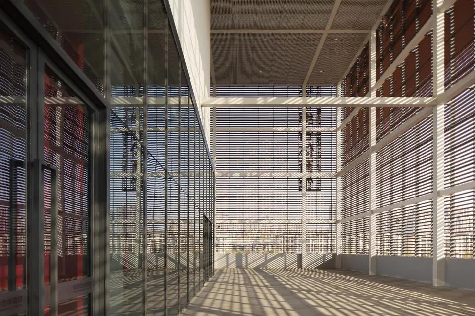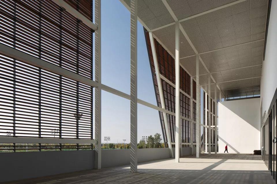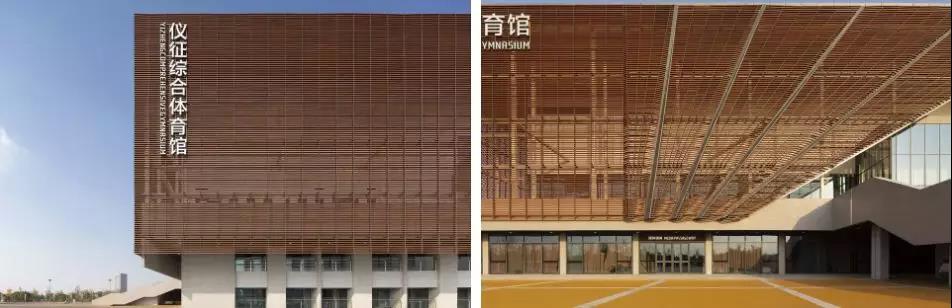 方正大氣的主體建筑以洋紅色陶棍為立面主材,原創的構造方式、精細的施工工藝以及多次1:1樣板推敲,創造了通透的帷幕效果和獨特溫暖的禮盒形象,把復合的功能簡潔整體地蘊含于其中。通過對主入口、主對景等部位的立面開放處理、公共交往空間與透過陶棍的自然光線的交織融合,整個立面在城市界面相對完整,在內景界面相對開放,賦予了儀征市文體產業 “拉開序幕” 的寓意和“正趨朝霞”的未來憧憬。