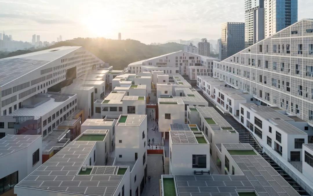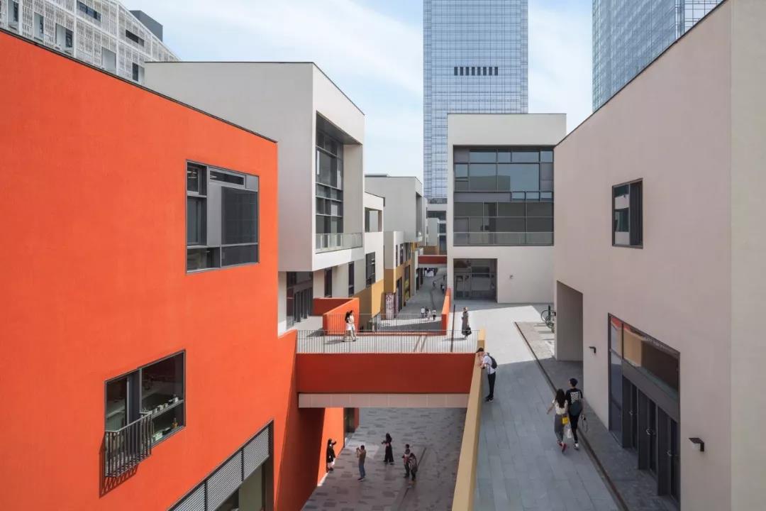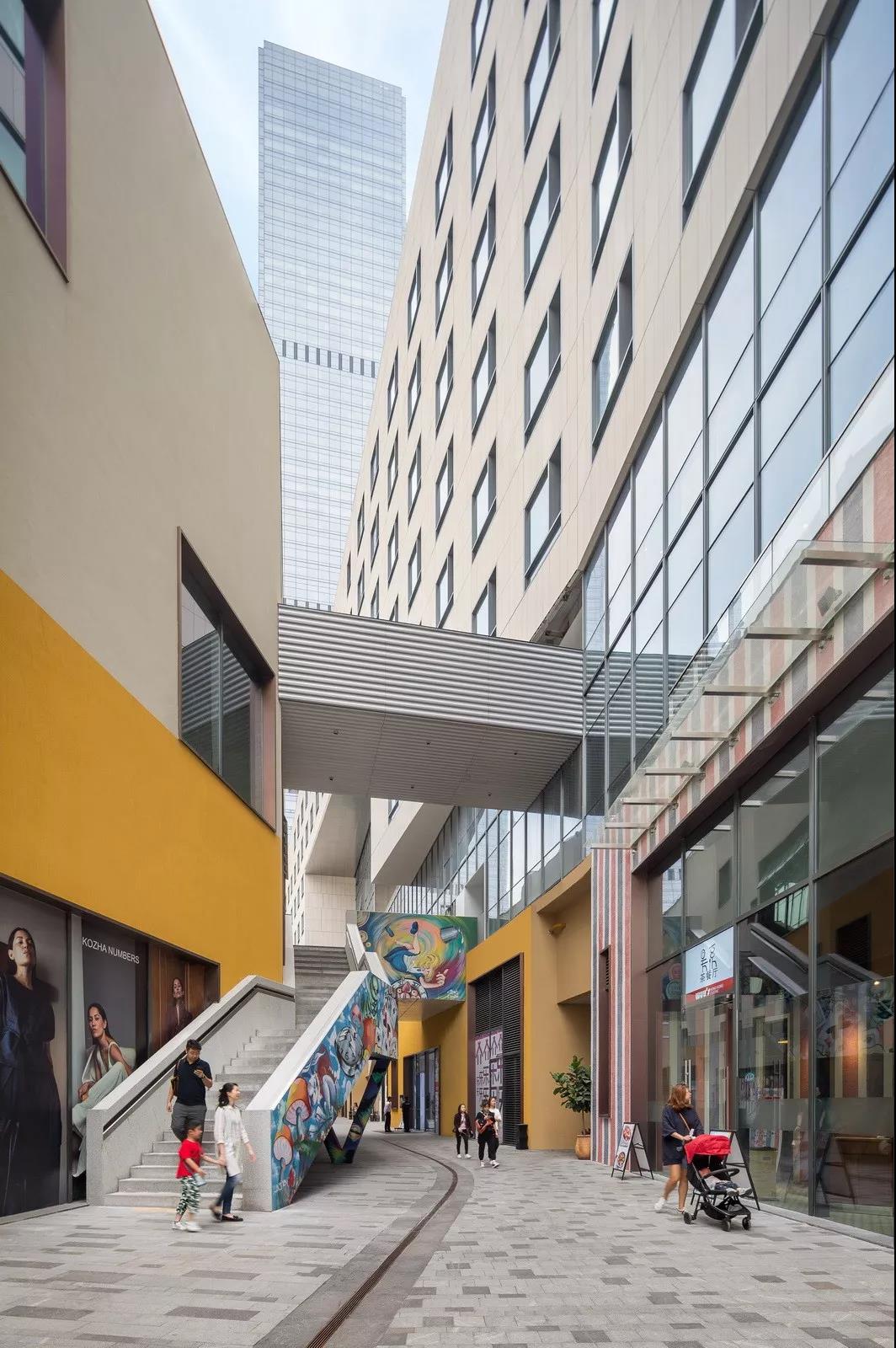 C區LOFT辦公由二十多棟3~4層的小型建筑組合成“村落”,建筑呈組團式排列,每個組團自成院落,內部小巷寬4~6m,而組團之間為開放廣場,街道寬度為8~15m,組團建筑體量穿插組合,形成架空通道、露臺、庭院、陽臺、過廊等豐富的空間形態。辦公與商業平臺之間以豎向交通連接,辦公人群下樓即可漫步商業街,上樓又可繼續工作,往北A區可居住,往南去往D區可看展覽,深業上城 LOFT以新的建筑空間模式創造了多維度的生活方式。
