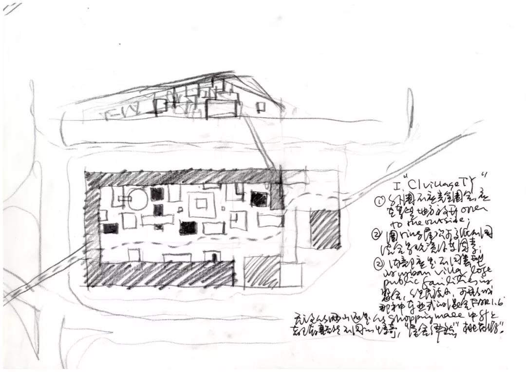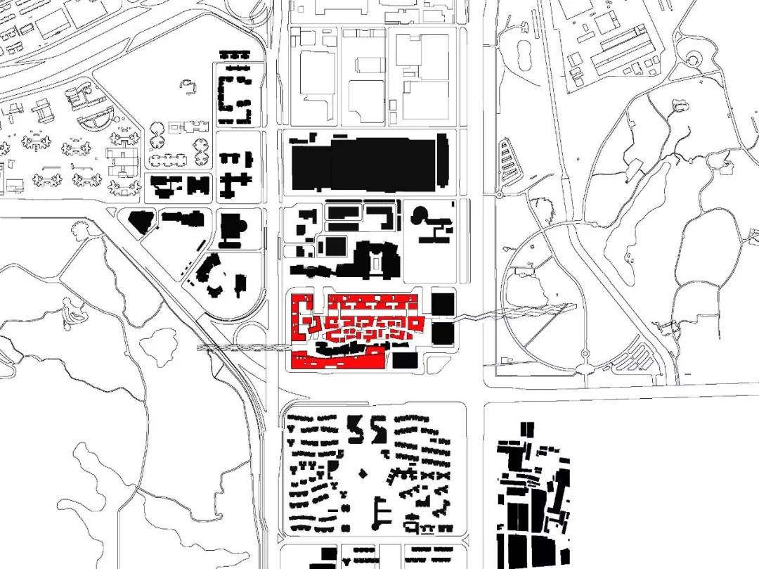 同時向內圍合出一個安靜的空間,以細致的步行街道聯結3-4層的高密度的辦公 LOFT,排列出一個高低錯落,空間變化豐富的小鎮,其中納入LOFT劇場、展示交易中心等公共活動空間,從外圍的“大”和“實”逐漸過渡到內部“小”而“虛”非常有活力的區域。讓商業、辦公與住宅人流在同一街區活動,創造了一種居住、辦公、商業與文化空間融合的聚落式街道生活新模式。