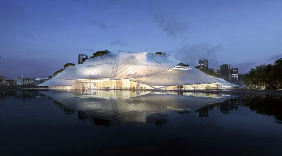 大劇院坐落于浙江義烏,占地4.7萬平方米,總建筑面積約9.5萬平方米,包含了1600座的大劇場、1200座的中劇場及可容納2000人的國際會議中心。MAD的設計中,遠山是背景,近水是舞臺,大劇院猶如義烏江上層疊起伏的風帆孤舟,安然優雅地漂浮于水面之上,與江水相映,柔和共鳴。