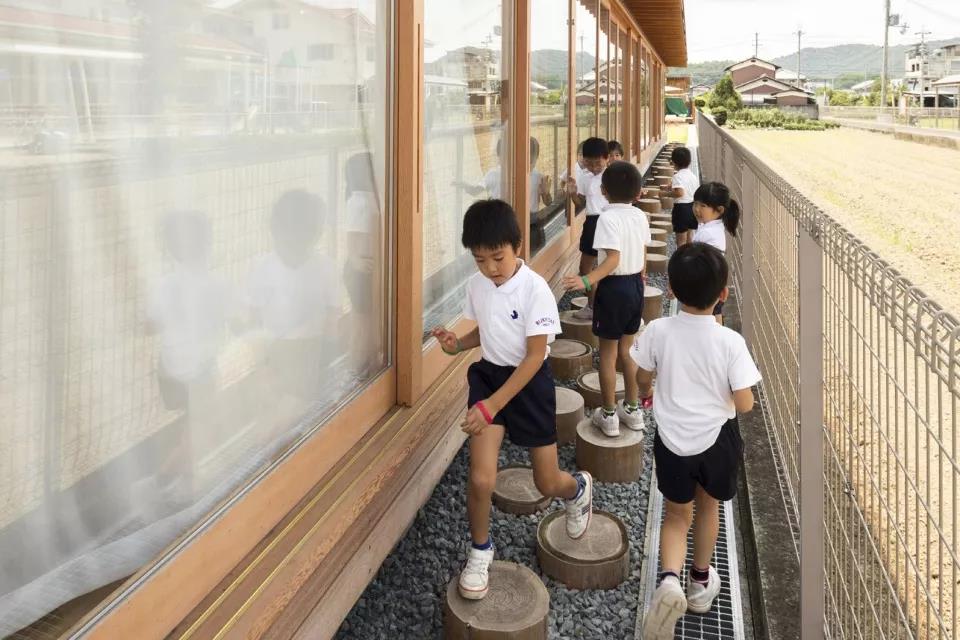 ▼孩子們在幼兒園旁的樹樁活動區玩耍