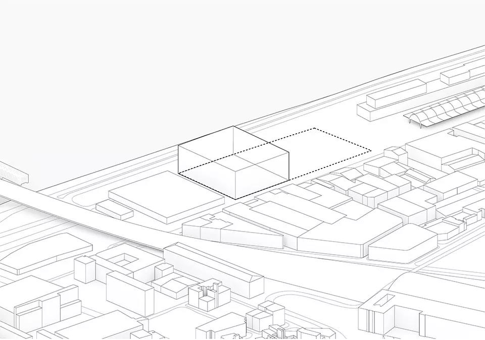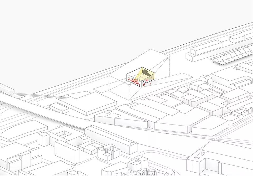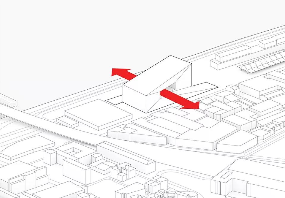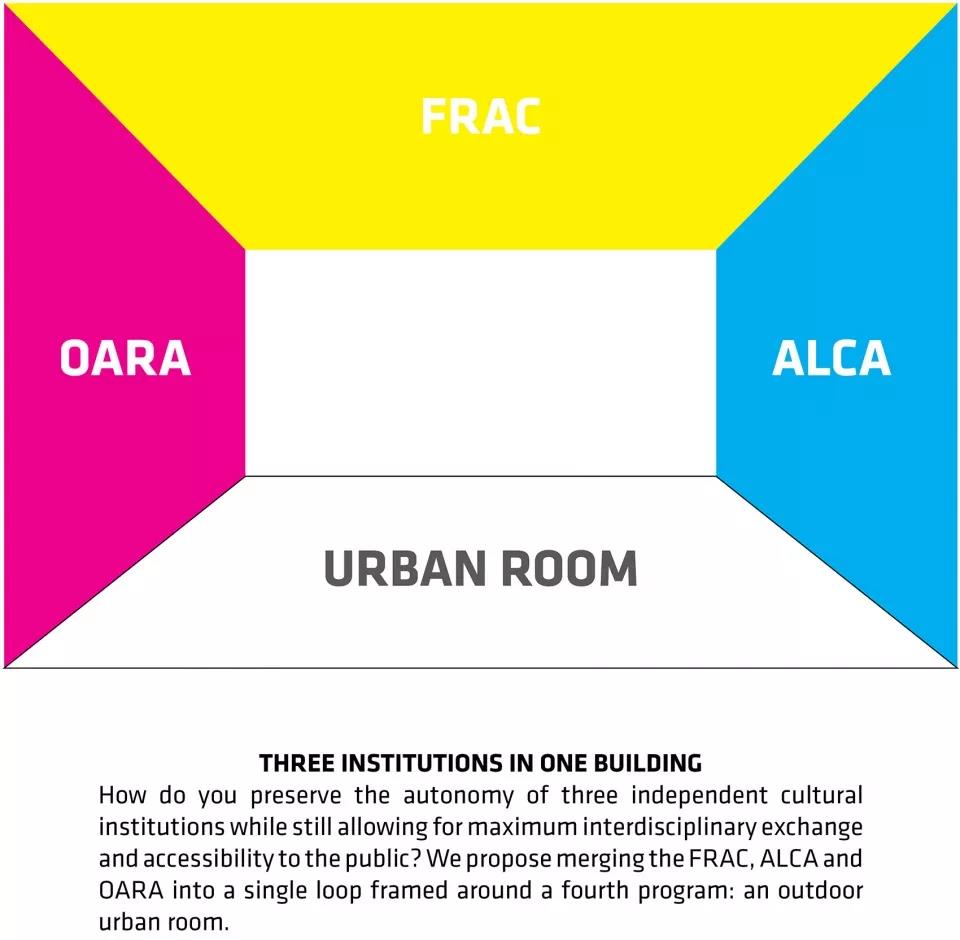▼設計示意圖:循環的體量匯聚了FRAC、ALCA以及OARA三個獨立的當地藝術機構,并在中央創建了一個新的“城市客廳”,以促進公眾的參與,盡可能地增強建筑的開放性。©BIG