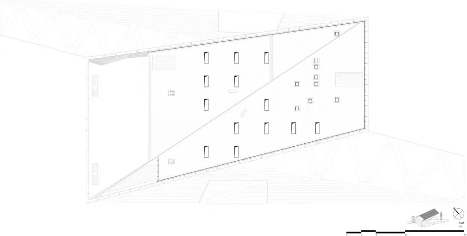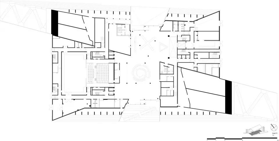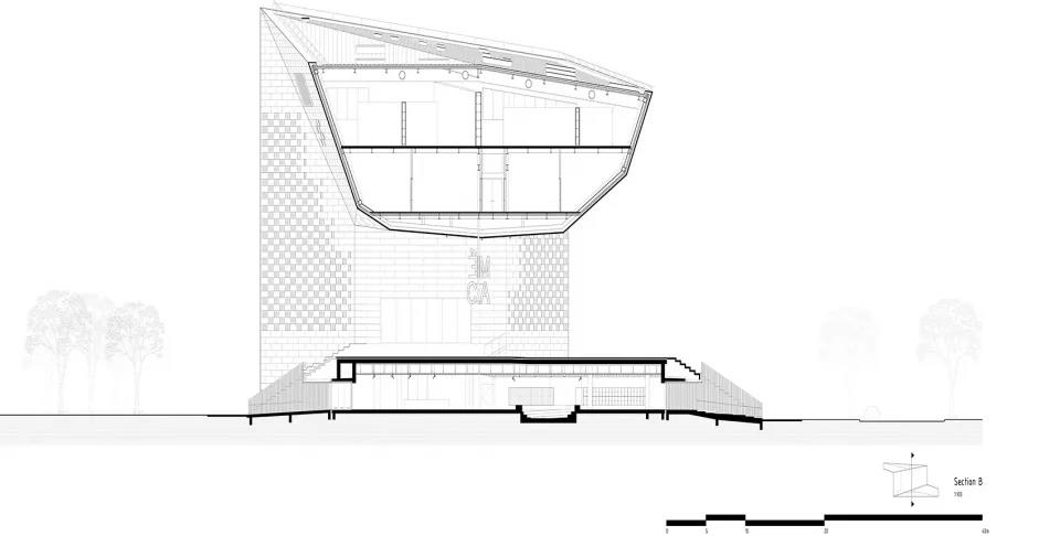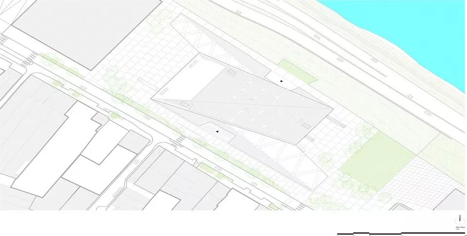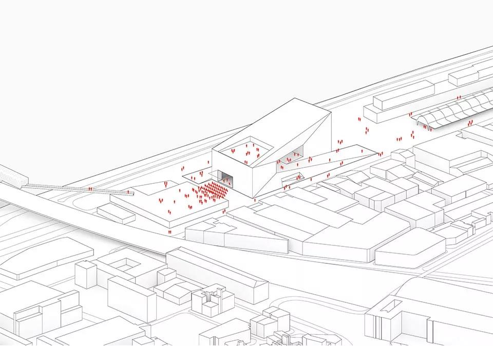 該建筑被構想為一個包含文化機構和公共空間的“環路”:首先,河濱步道以斜坡的形式過渡到作為“城市客廳”的廣場區域, 隨后與建筑立面融為一體(透過立面可以瞥見OARA的舞臺空間以及ALCA的辦公區),最后在FRAC展廳的屋頂天窗處形成閉合。