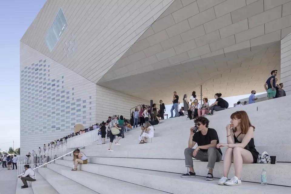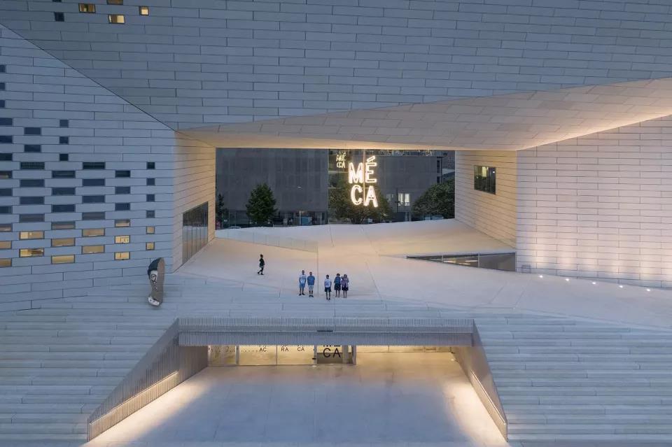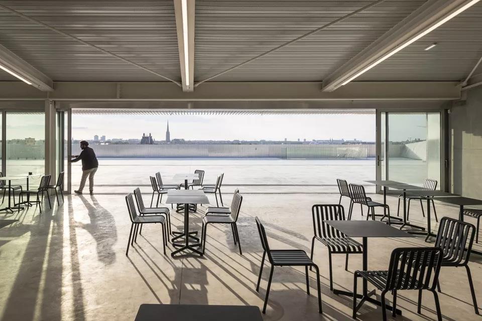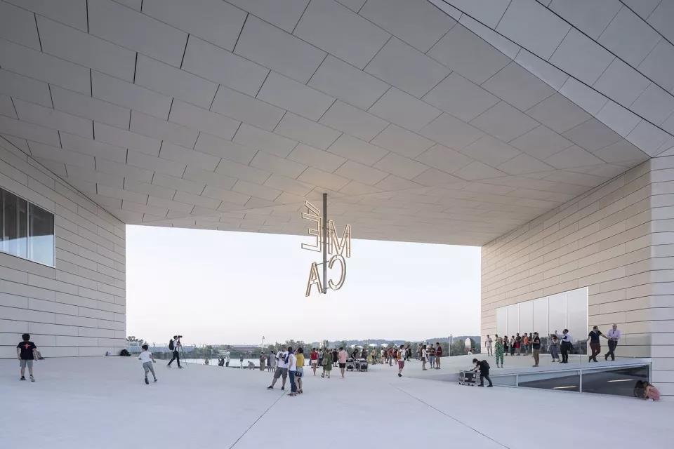 一系列臺階和坡道將公眾直接引導至位于MéCA中央的1100平方米的戶外公共空間,使來訪者能夠在Quai de Paludate大街與河濱步道之間自由地漫步。7米高的MéCA標牌通過白色LED等照亮了該區域,猶如一盞具有城市尺度的、充滿現代感的吊燈。