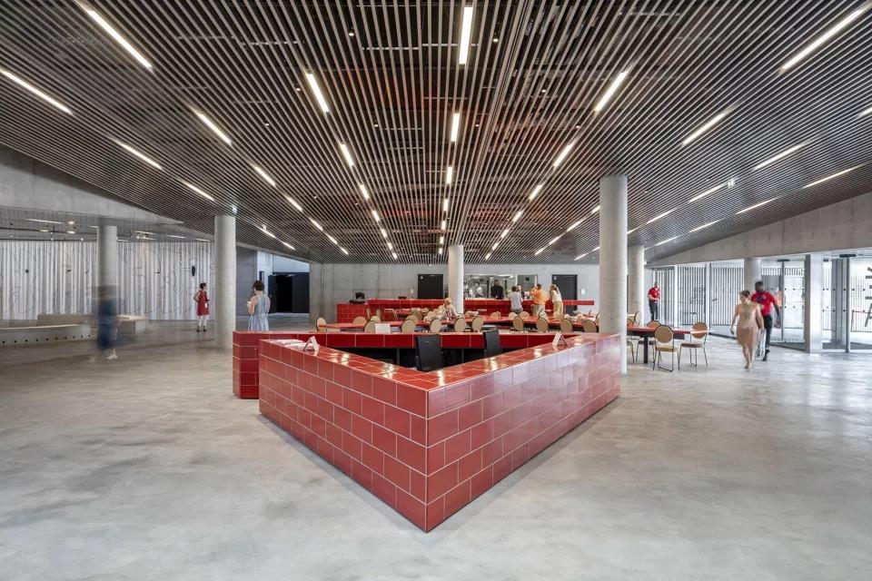 從首層進入MéCA之后,來訪者將到達大廳區域。人們可以在螺旋形的下沉空間中就坐休息,或者在Le CREM餐廳享受美食。餐廳中的紅色家具和軟木座椅是由BIG以城市的葡萄酒文化為靈感而設計。