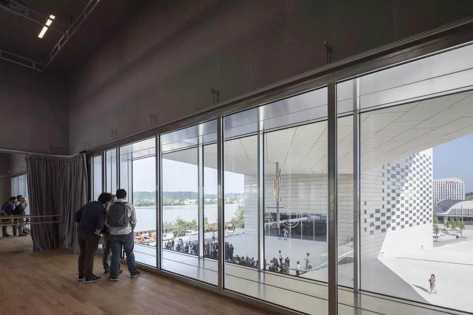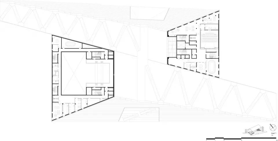 餐廳和電梯為參觀者提供了一個巨大的“潛望鏡”,使其能夠看到戶外“城市客廳”里的活動,同時也在室內和室外空間之間建立了對話。