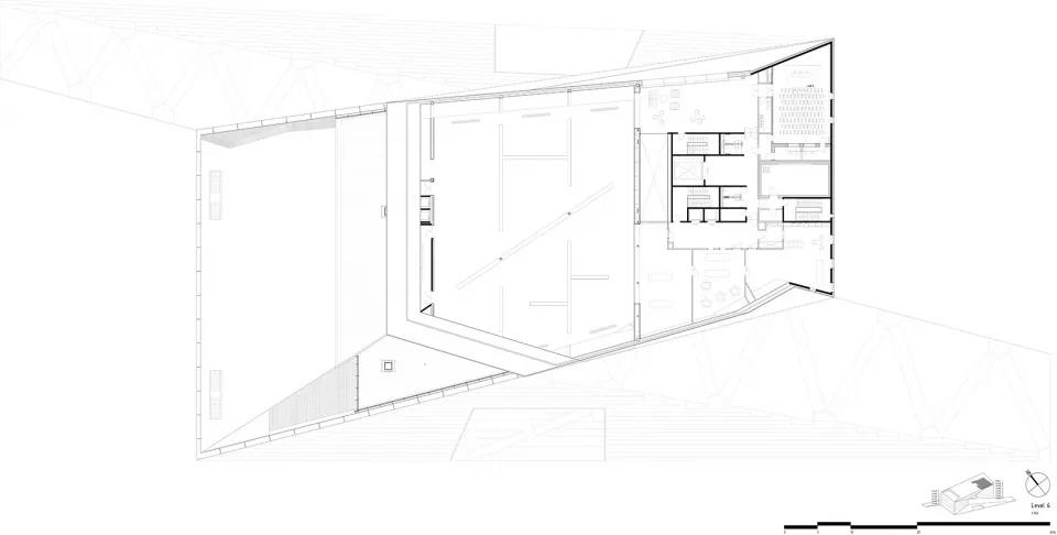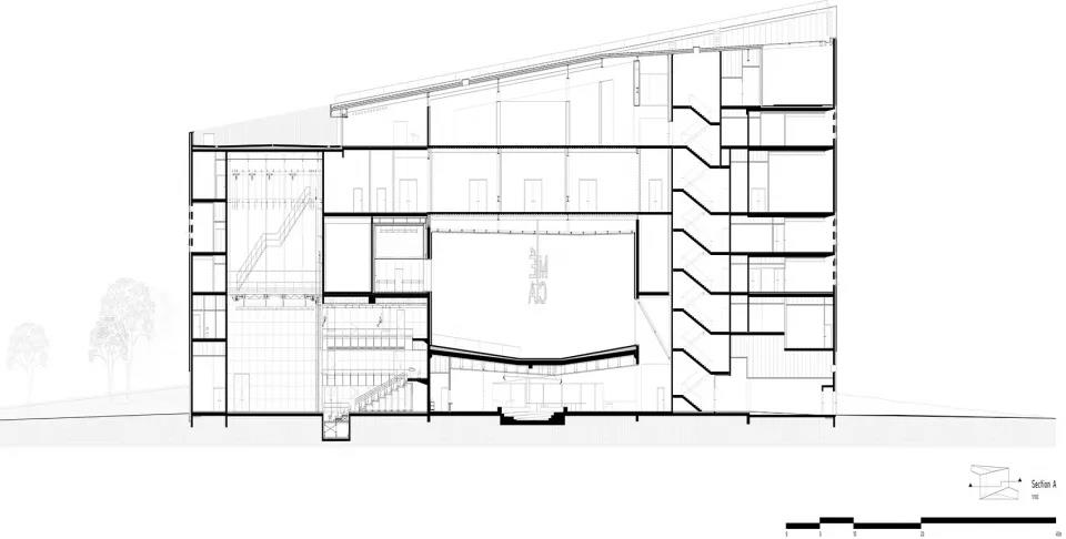 同樣在建筑首層,參觀者可以買票進入OARA的劇場以欣賞表演。劇場可容納250位觀眾,設有靈活的座椅和聲學系統,并搭配由混凝土、木材和穿孔金屬板構成的黑色棋盤格墻面。上方的樓層包含了ALCA的******院,紅色調的空間包含了80個座位。同層還設有兩個制片辦公室和項目策劃區域。