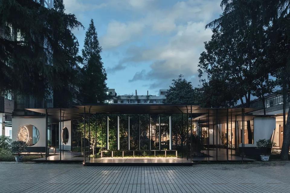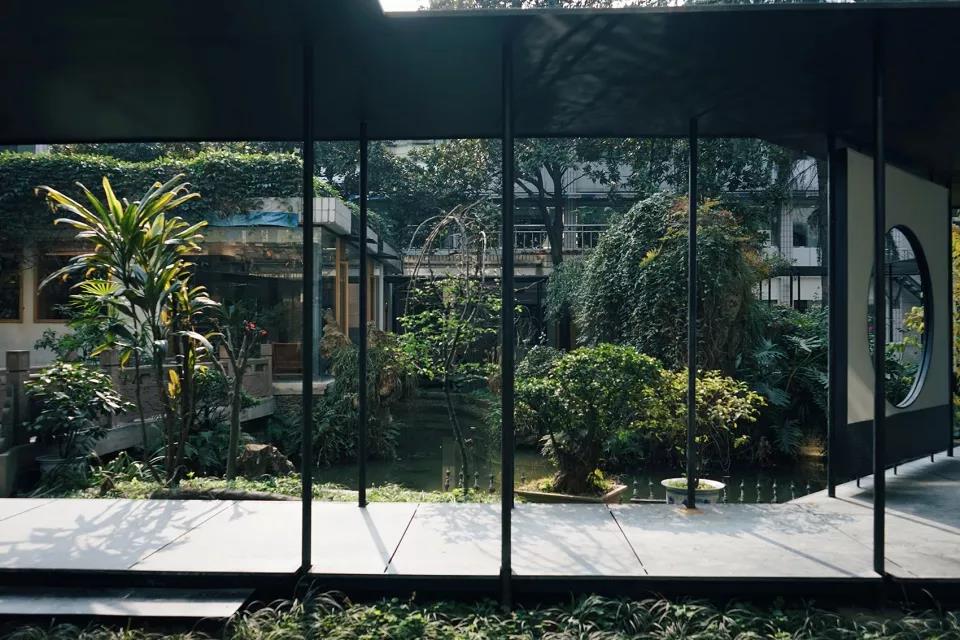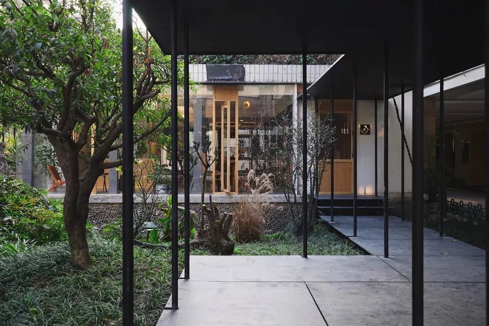 回廊借用場地原有路徑,重建并延長過去的臨時(shí)連廊,新建回廊避開了庭院中的所有的水石花樹。將原酒店大堂改為茶室,回廊起點(diǎn)與終點(diǎn)均是茶室,最終構(gòu)建出“疏密得益,曲折盡致,眼前有景”的庭院景觀。