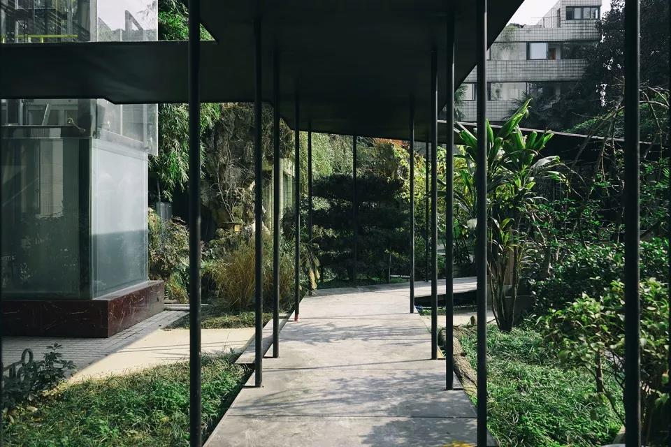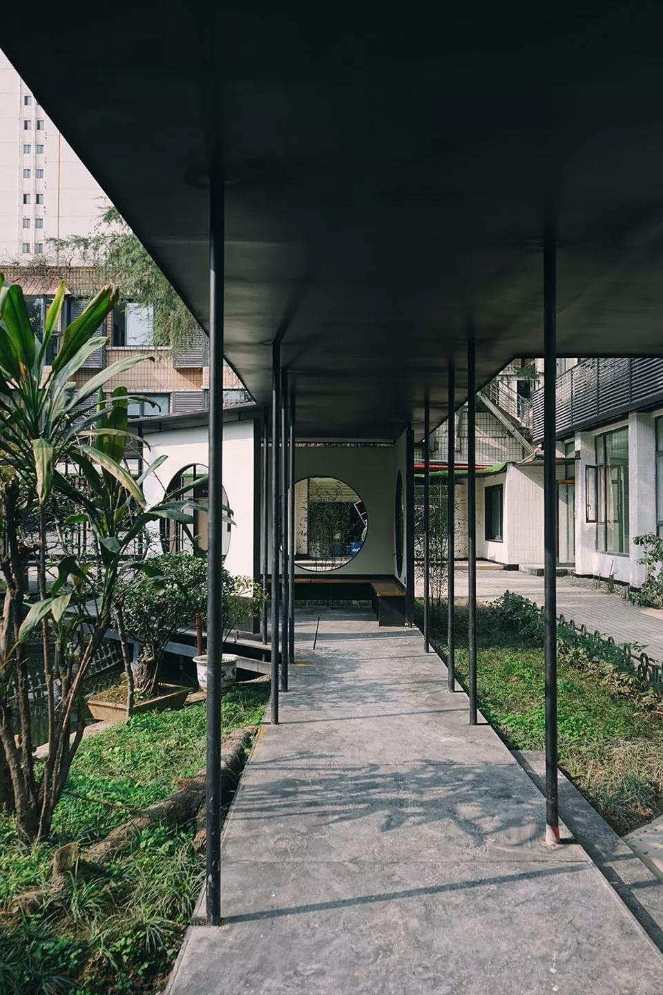 回廊構(gòu)造為輕質(zhì)鋼結(jié)構(gòu),細(xì)柱,反梁,地面均采用深灰色***碳漆噴涂,相同的材料消減了物質(zhì)屬性,構(gòu)建出超越物質(zhì)感受的巡游路徑。回廊避開了庭院中的所有的水石花樹,構(gòu)建出“疏密得益,眼前有景,曲折盡致”的園林景觀。