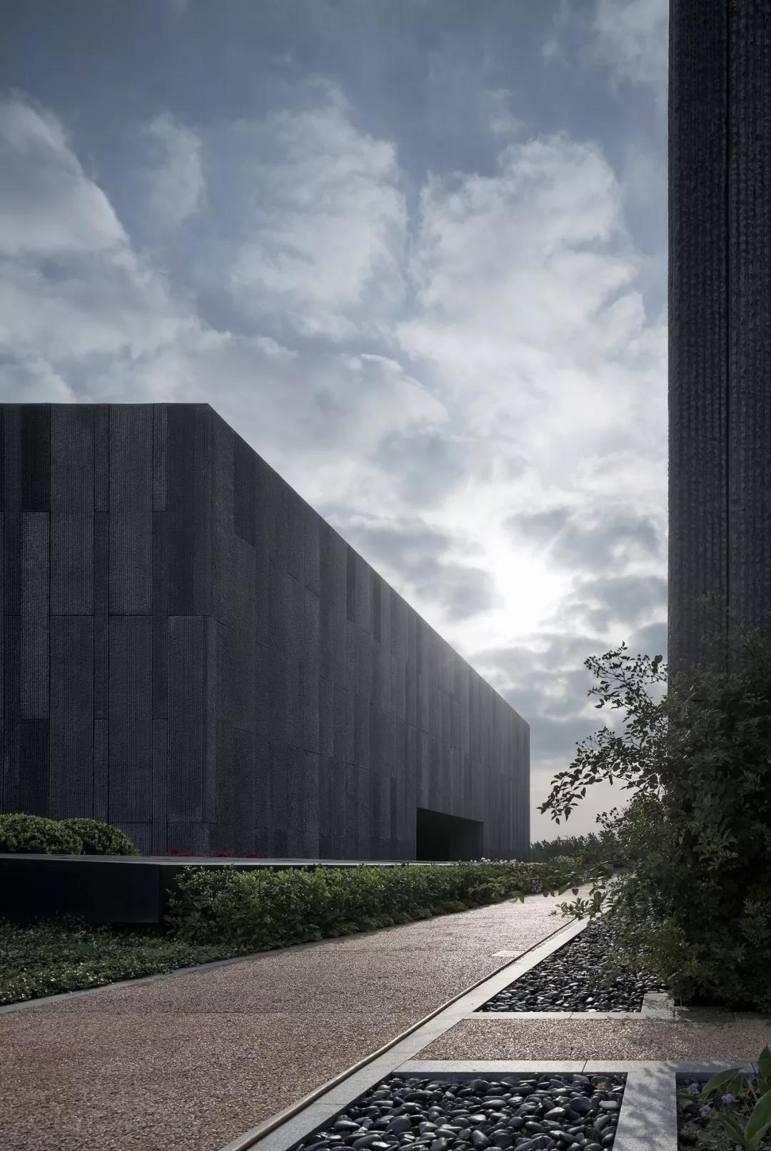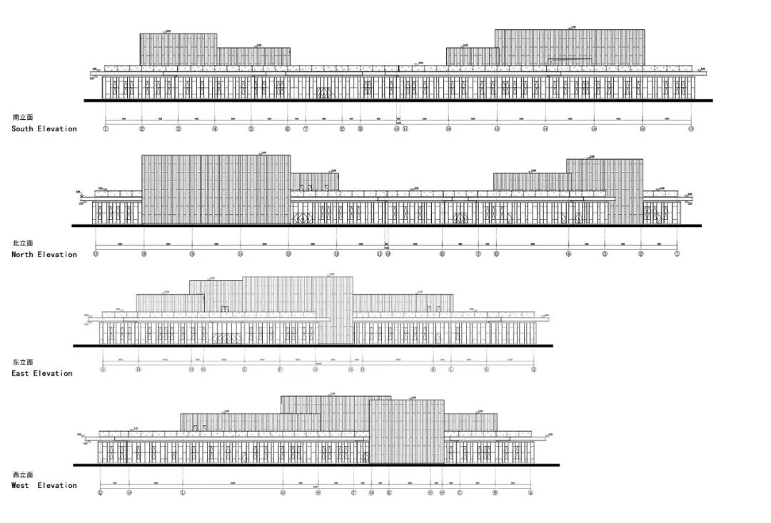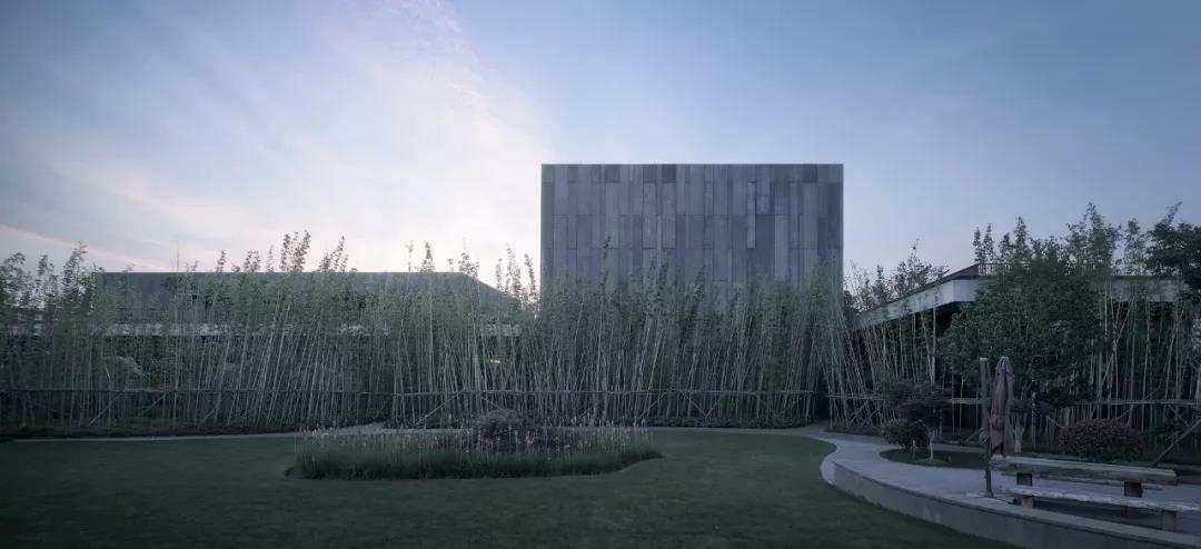 一層主要立以玻璃幕墻為主,不同明度綠色玻璃又韻律的組合,再加上幕墻立梃猶如“竹林”意向的襯托。整個立面作為維護結構被虛化。幾個凸出體量的立面肌理也延續“竹子”的豎向分割,渾然一體。純粹和完整的立面也是各建筑設備精心布局的結果:各設備管井和出口都統一整合在屋頂設計。