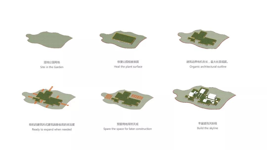建筑主要功能集中一層布置(層高7.0m),最大化減少對公園的壓迫感。同時,一層屋頂花園又是被抬高的公園“植被”,既修復了生態公園的綠化界面。又是視野極佳的“觀景臺”,提供了優美的活動場地。局部凸出的建筑體量(陳列館、展示廳、多功能廳等)退在屋頂花園后,猶如幾個“雕塑”,強調建筑的“分量”感,也增加了整個建筑的空間層次。