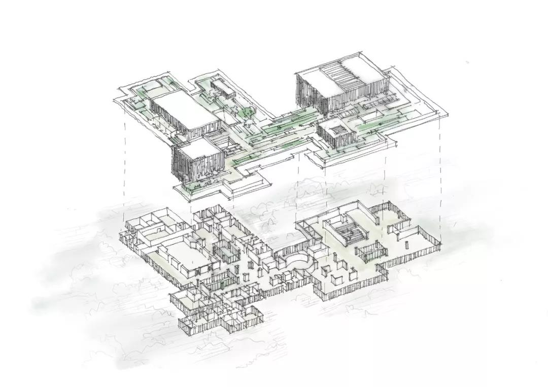隨著基金會的不斷發展壯大,所需功能空間也會不斷增加,設計充分考慮以后預留發展的空間需求,在不規則的用地范圍內采用了有機的平面形式,建筑輪廓能夠任意靈活的伸縮和調整。未來發展建筑可以從現有的布局自然的“延伸”出去而不破壞整體感。另一方面,曲折的外部輪廓可以破除建筑冗長單調的界面,這種穿插滲透式的布局策略也能將景觀和建筑相互滲透,確保對環境景觀造成最小程度的破壞。